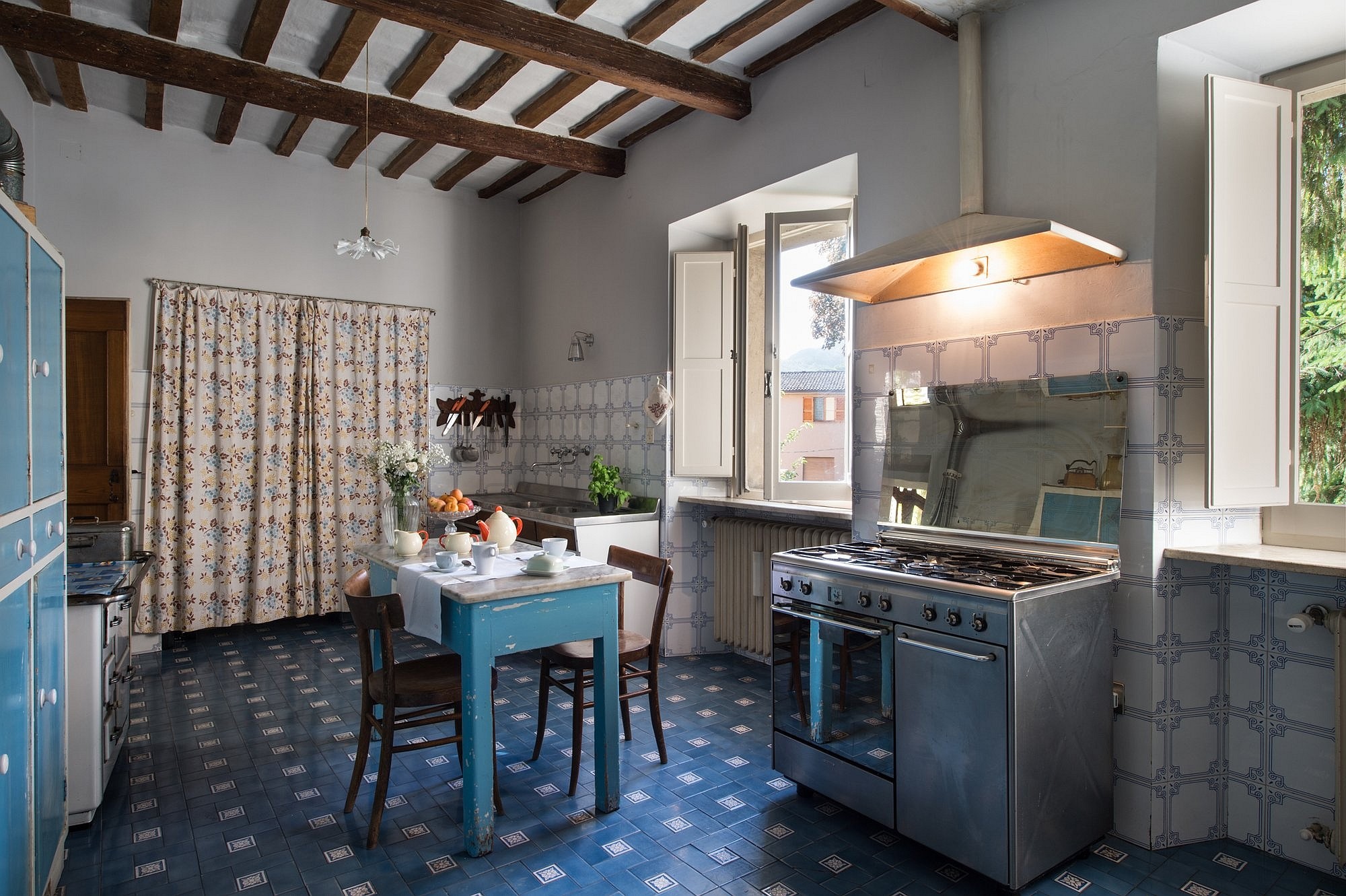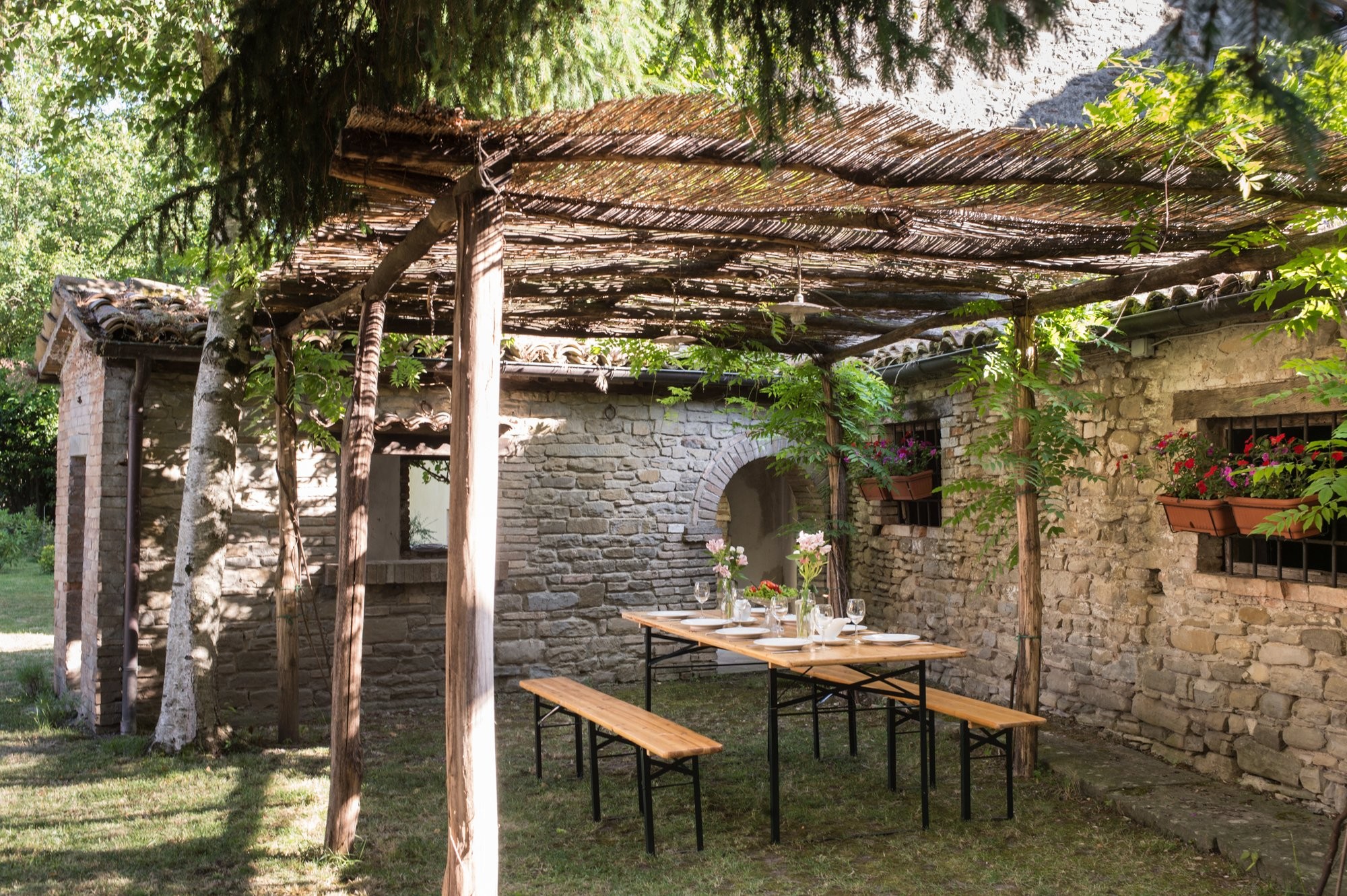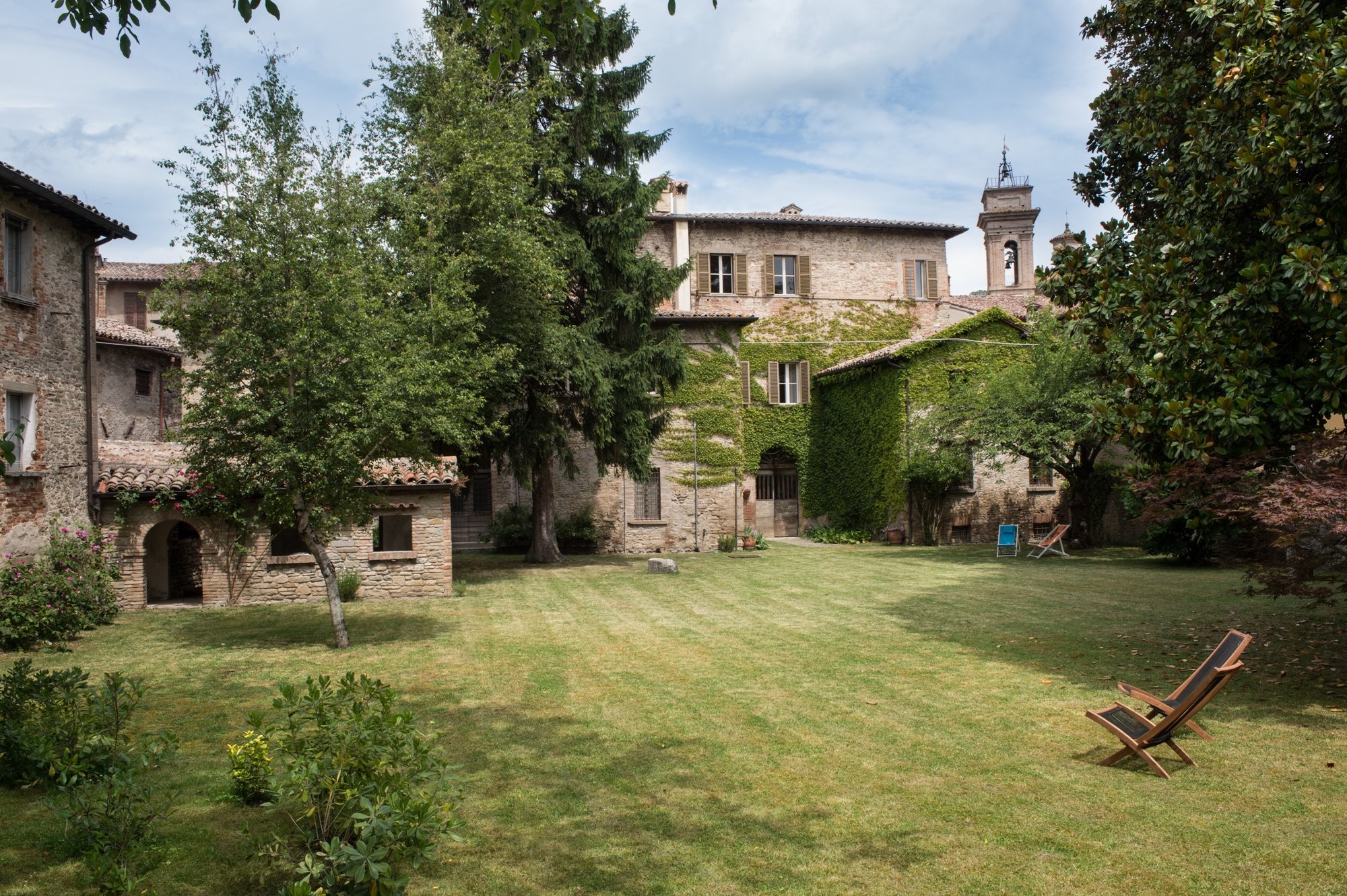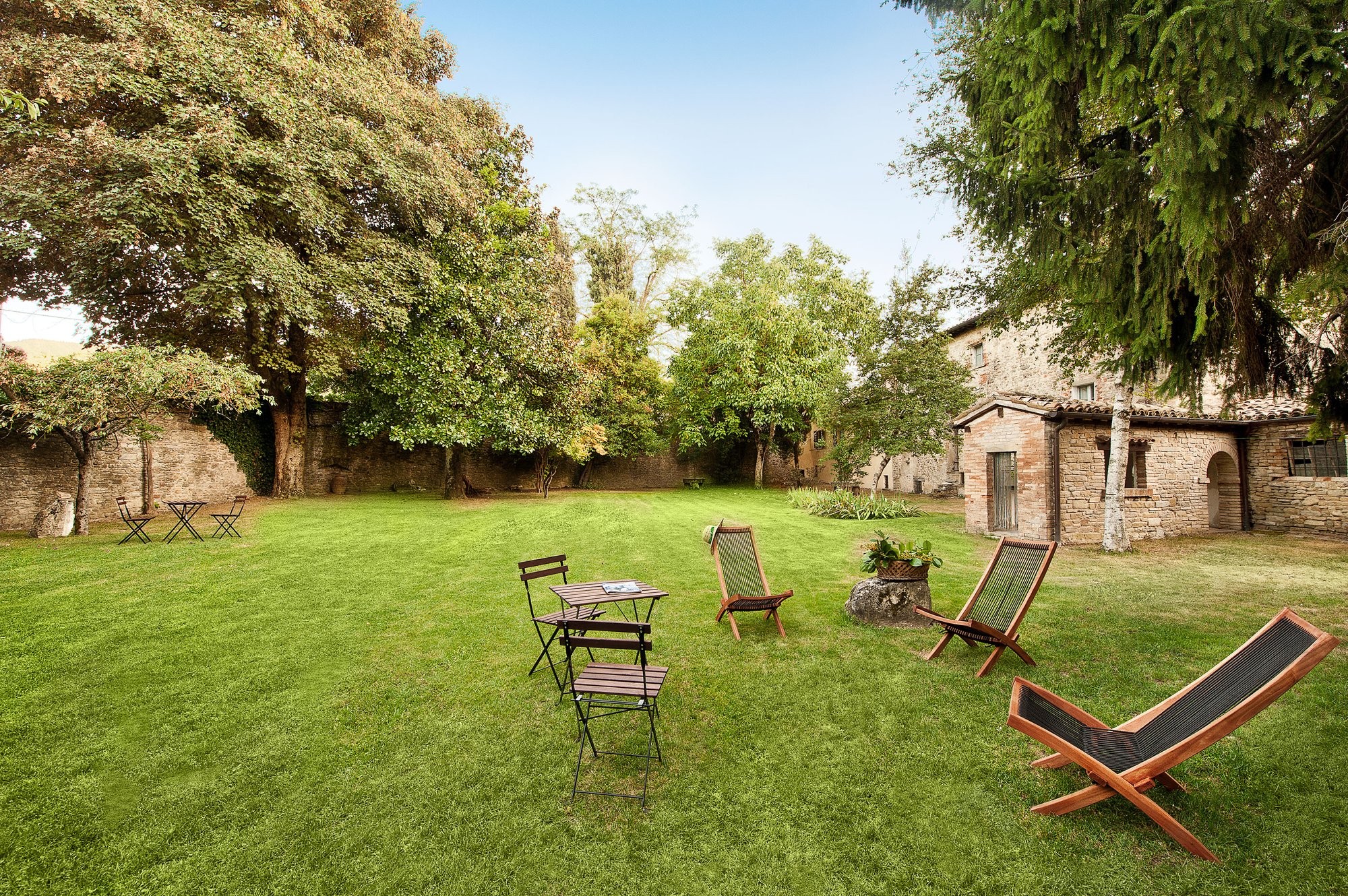 Le jardin central constitue un véritable havre de paix avec ses roses, ses agrumes, sa pergola et sa fontaine ancienne. De petits balcons et de larges fenêtres panoramiques offrent une vue sur le village et les collines environnantes des Apennins, reliant harmonieusement l’intérieur et l’extérieur.