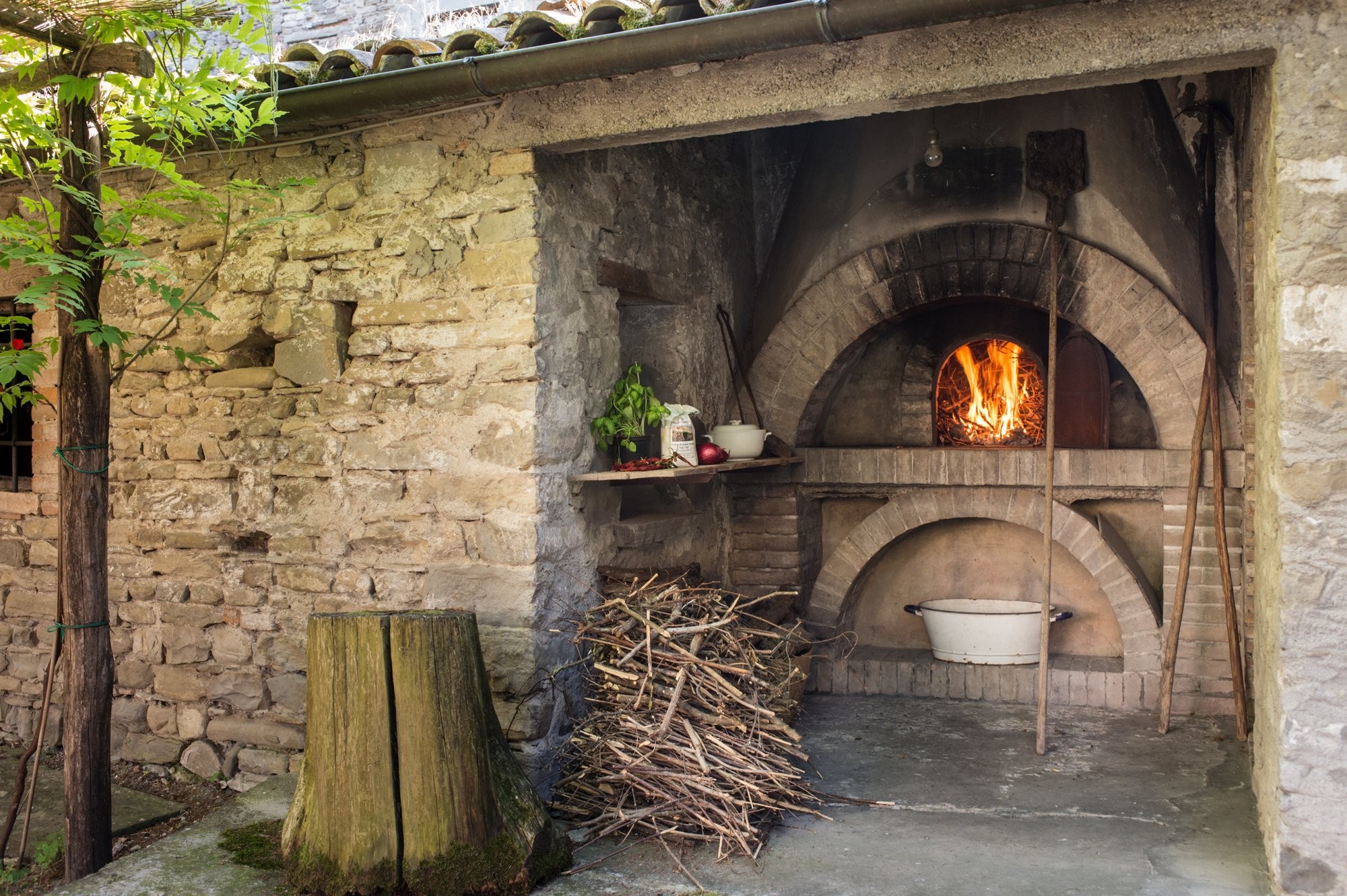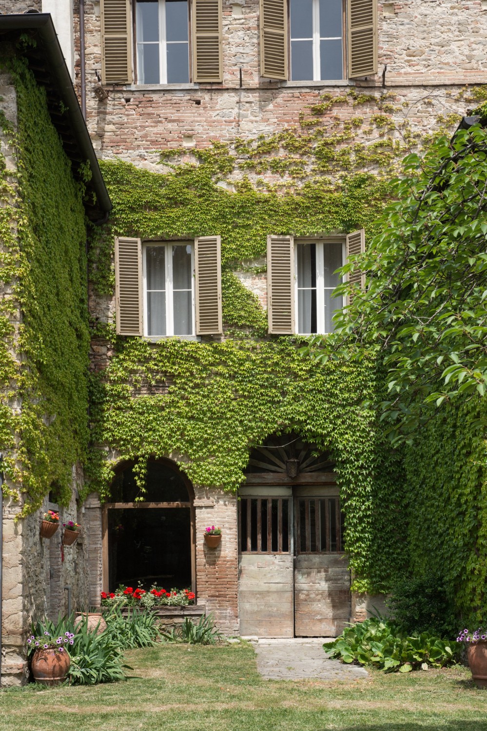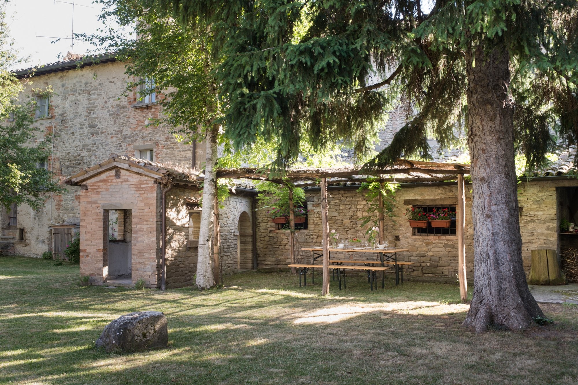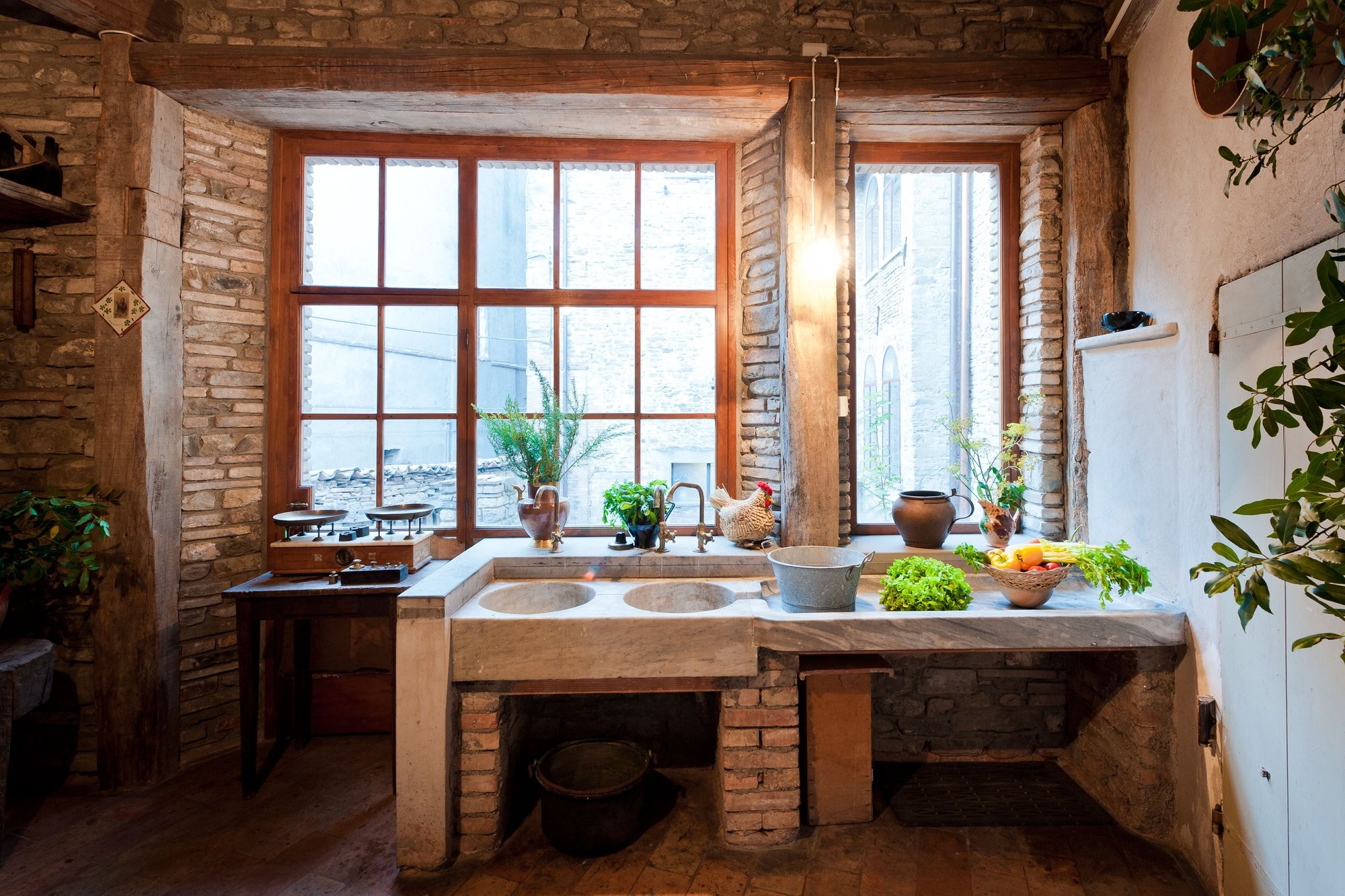 Le jardin central constitue un véritable havre de paix avec ses roses, ses agrumes, sa pergola et sa fontaine ancienne. De petits balcons et de larges fenêtres panoramiques offrent une vue sur le village et les collines environnantes des Apennins, reliant harmonieusement l’intérieur et l’extérieur.
