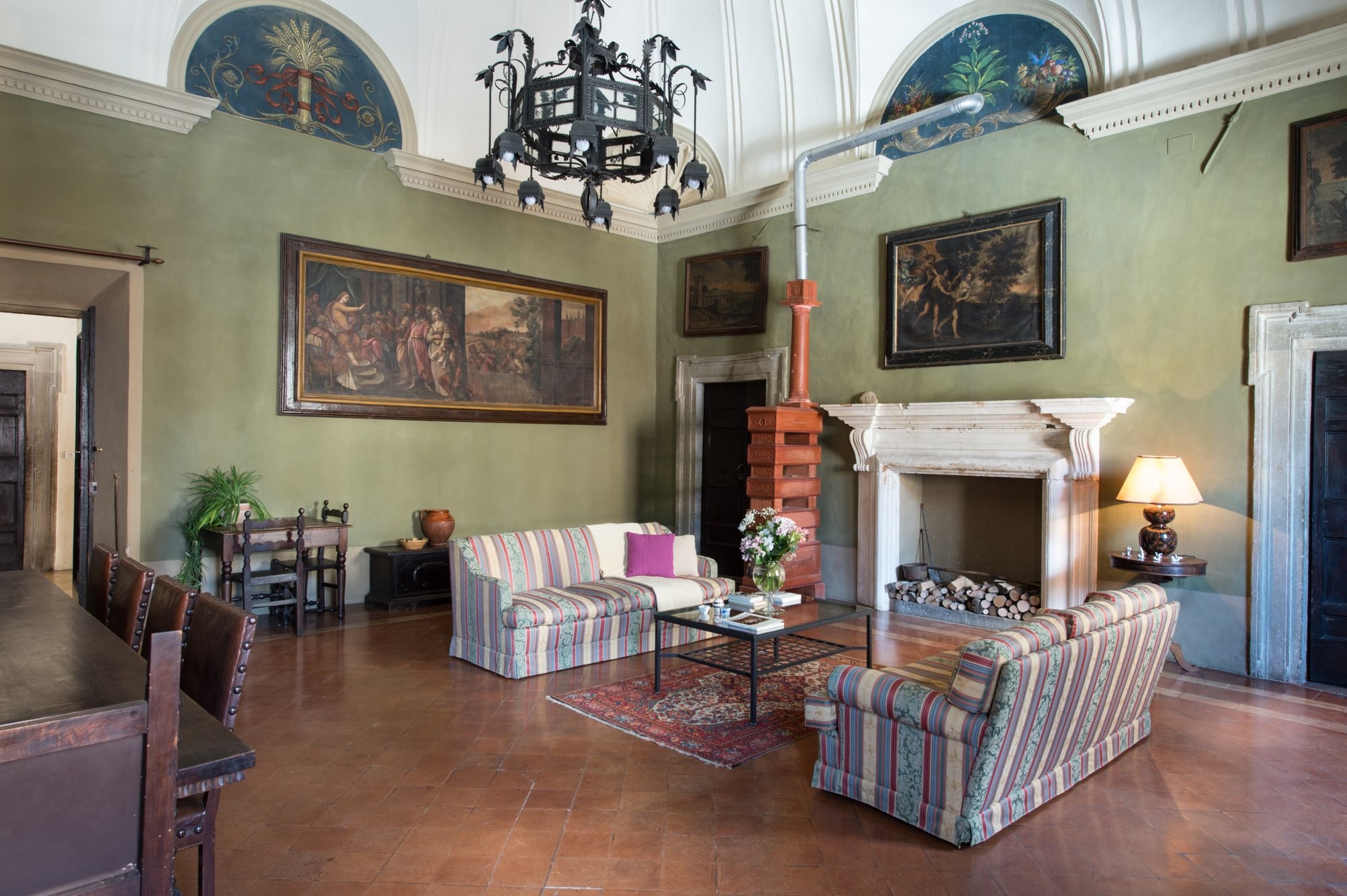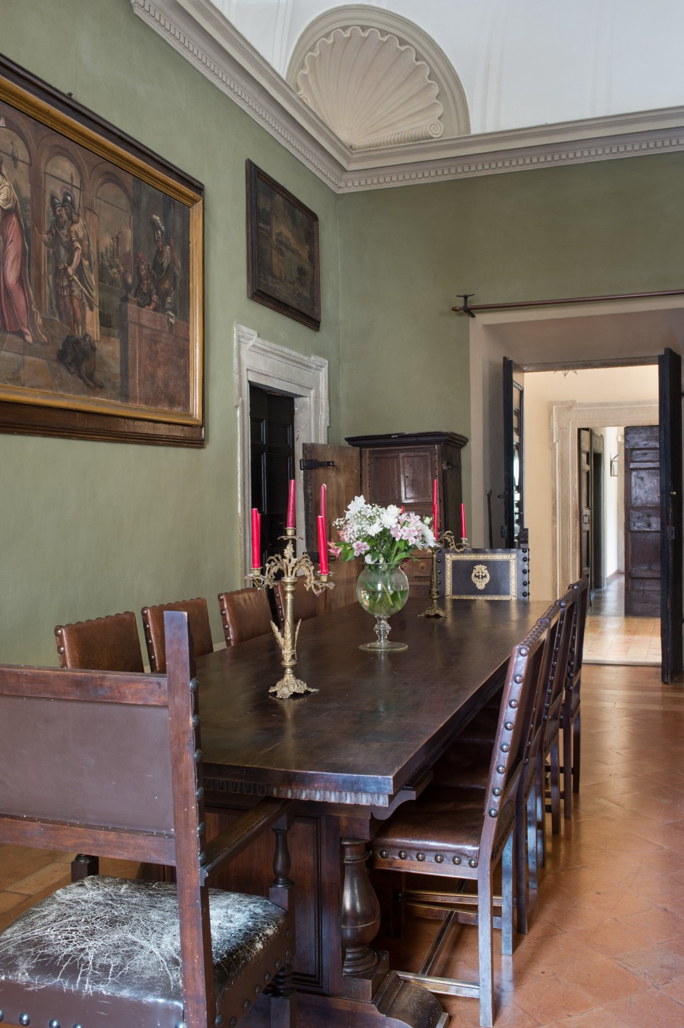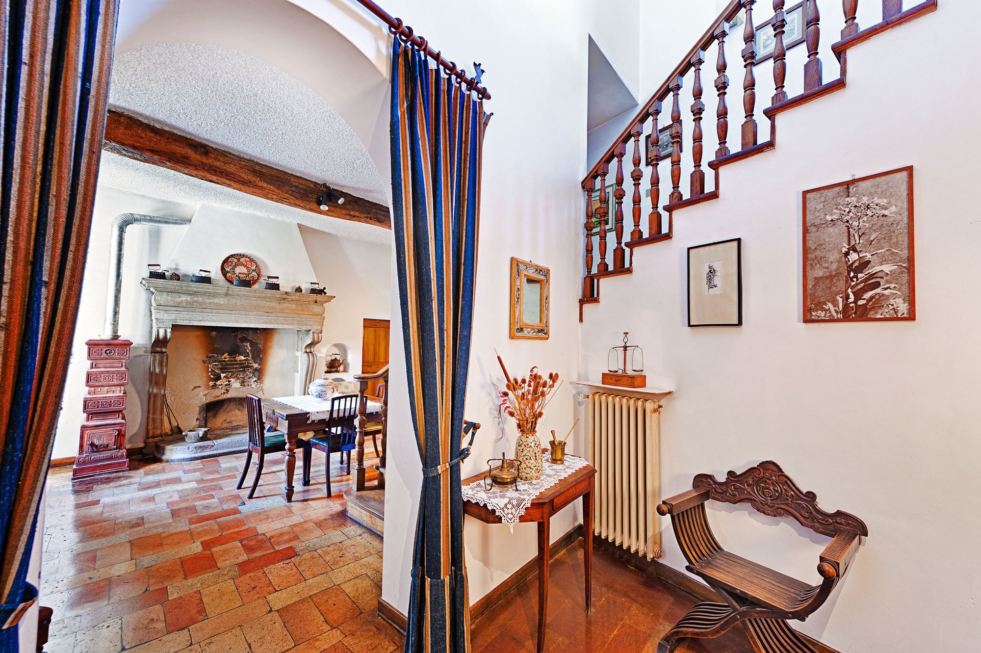 L’aile gauche abrite le piano nobile, décoré d’ornements Renaissance d’origine, de hautes fresques peintes à la main et de murs ayant traversé plus de 500 ans d’histoire italienne. L’aile droite s’étend sur deux étages et offre de vastes espaces de vie alliant le charme historique au confort moderne. La lumière naturelle illumine les portes voûtées, les corniches décoratives et les portes sculptées – chaque détail témoignant du passé noble de la résidence.
