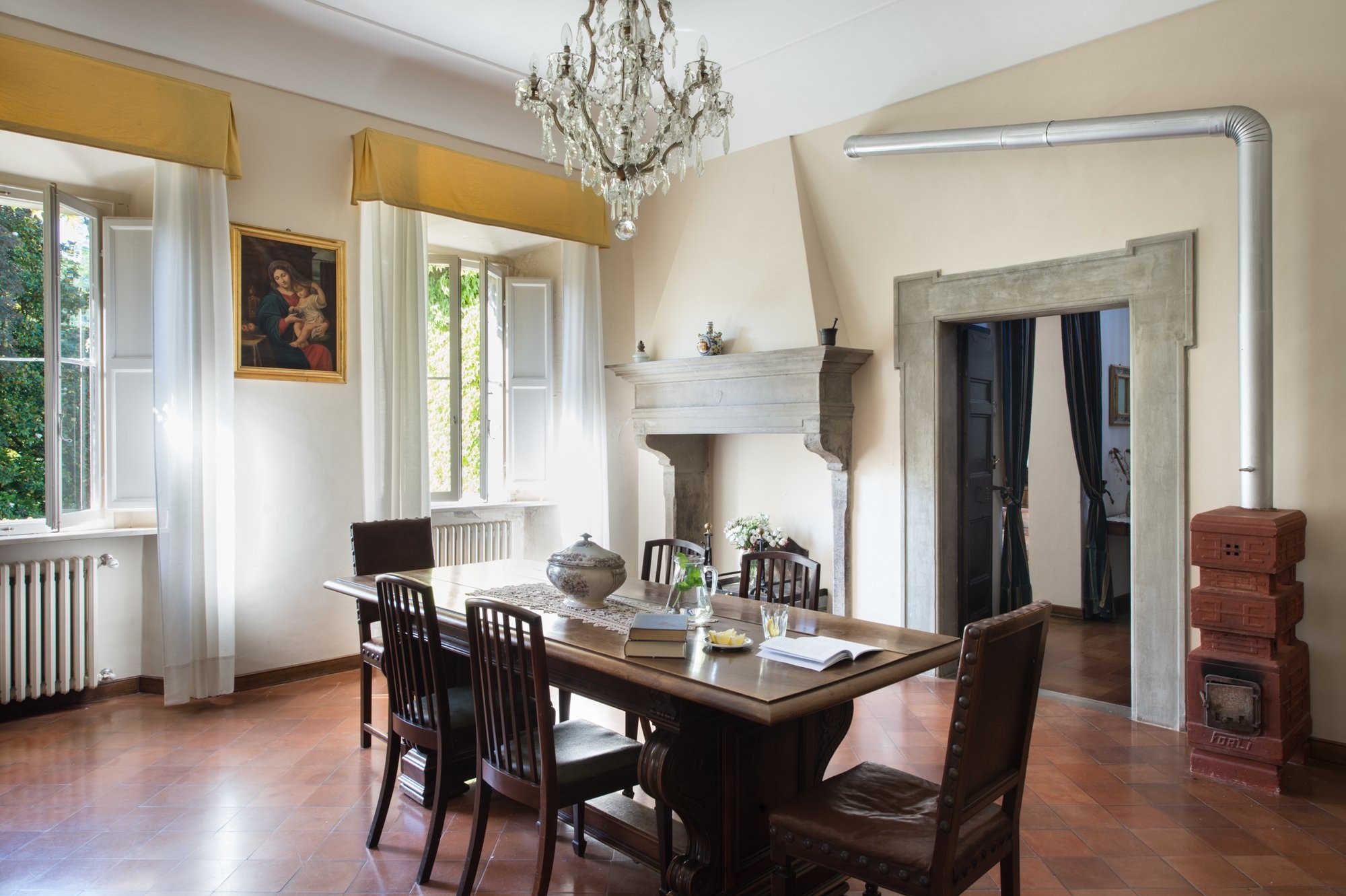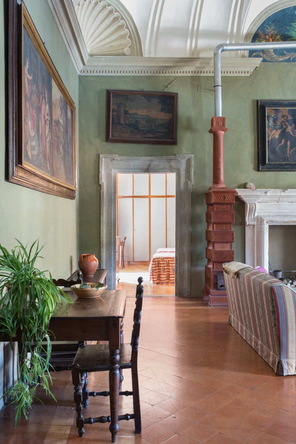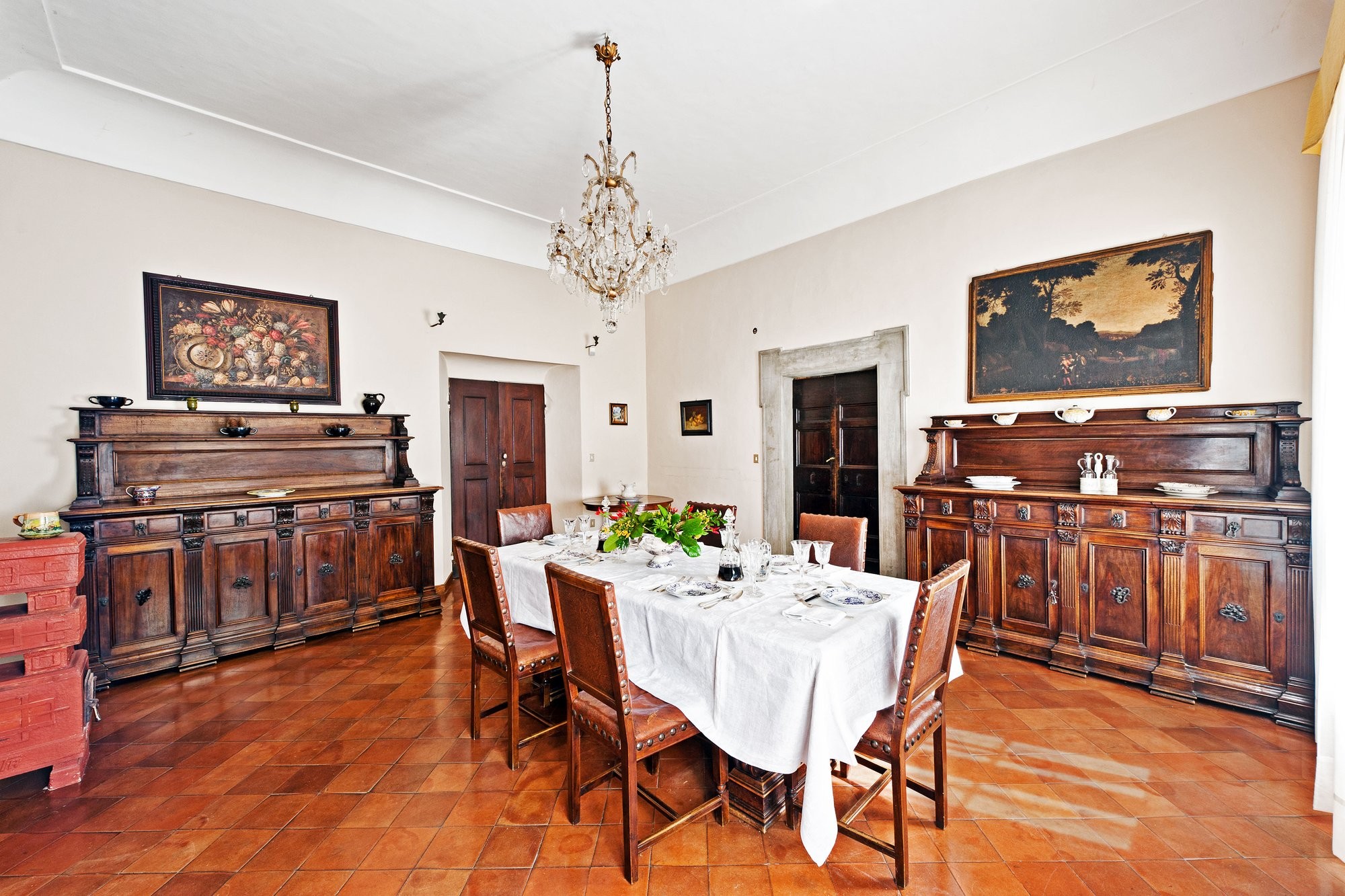 L’aile gauche abrite le piano nobile, décoré d’ornements Renaissance d’origine, de hautes fresques peintes à la main et de murs ayant traversé plus de 500 ans d’histoire italienne. L’aile droite s’étend sur deux étages et offre de vastes espaces de vie alliant le charme historique au confort moderne. La lumière naturelle illumine les portes voûtées, les corniches décoratives et les portes sculptées – chaque détail témoignant du passé noble de la résidence.
