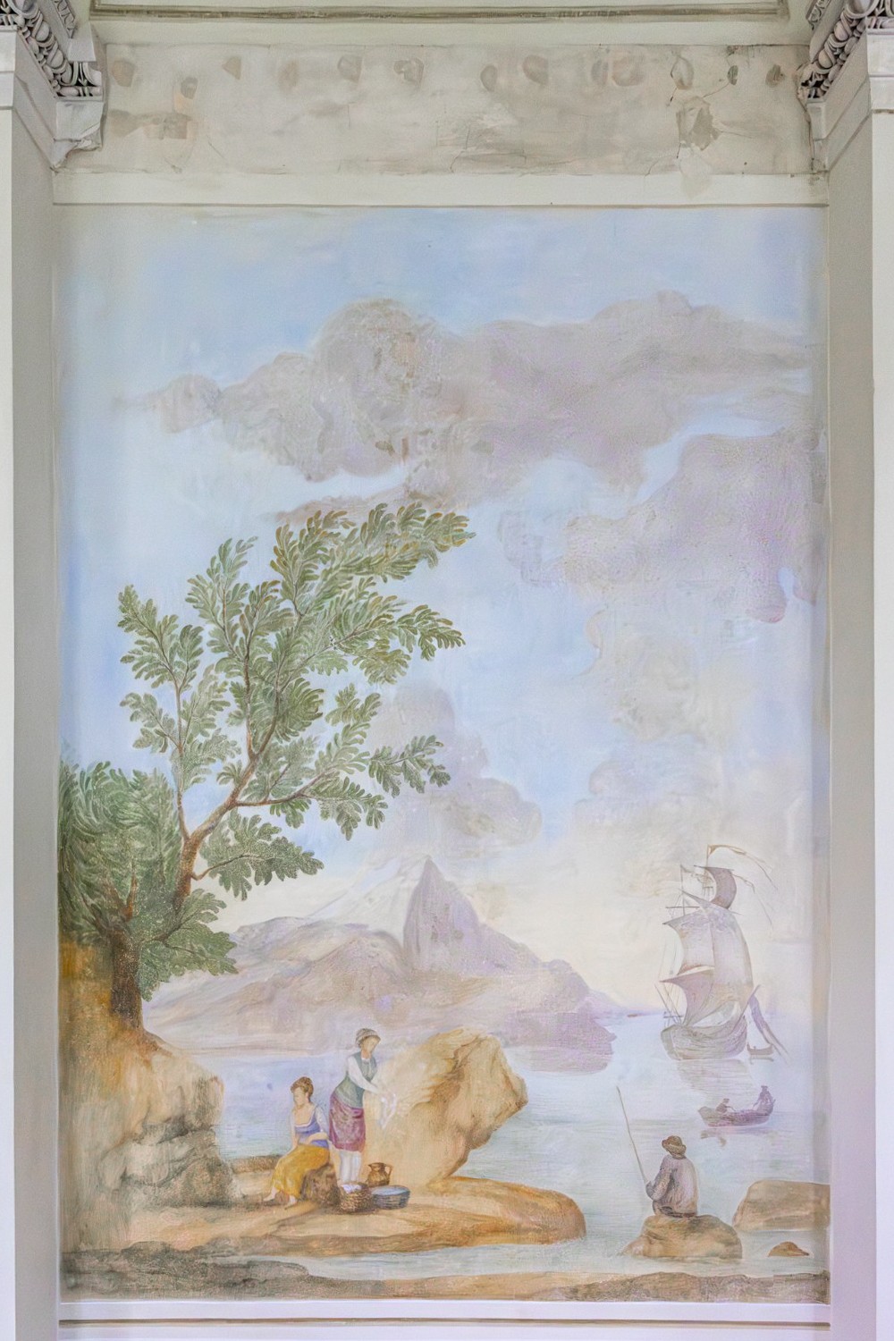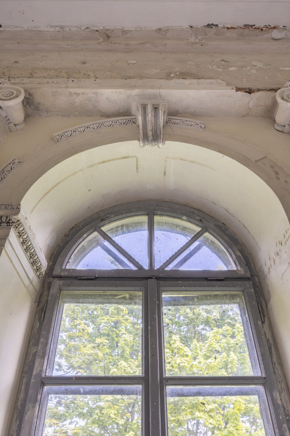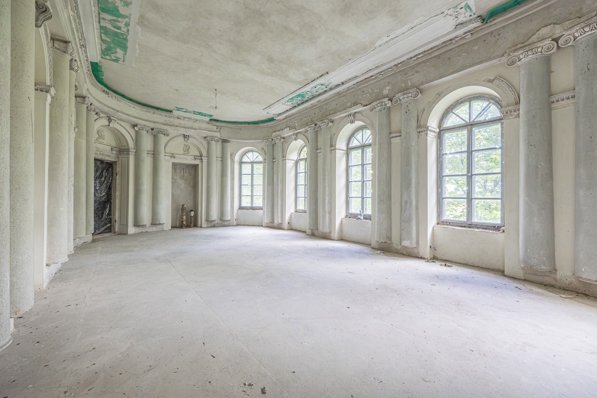 À l’étage, se situaient les pièces de réception, dont une grande salle à manger ainsi qu’une salle de bal dotée de colonnes en stuc de marbre en forme de demi-cercle. La salle de bal a été partiellement restaurée : les peintures murales ont été reprises et les fenêtres ont été remplacées.