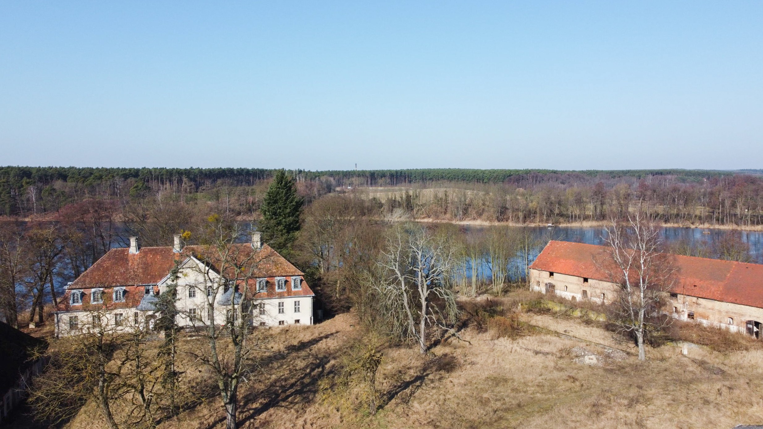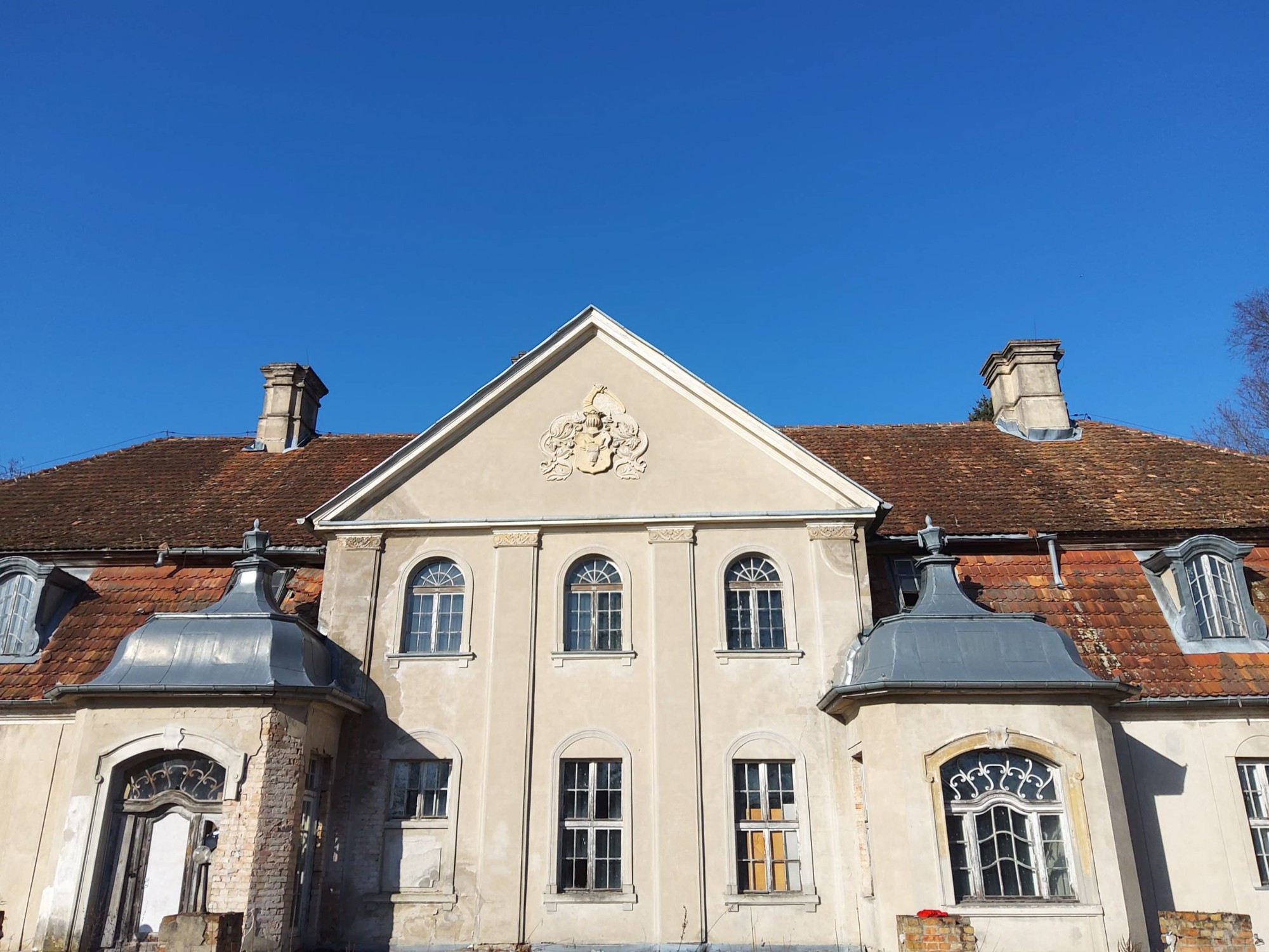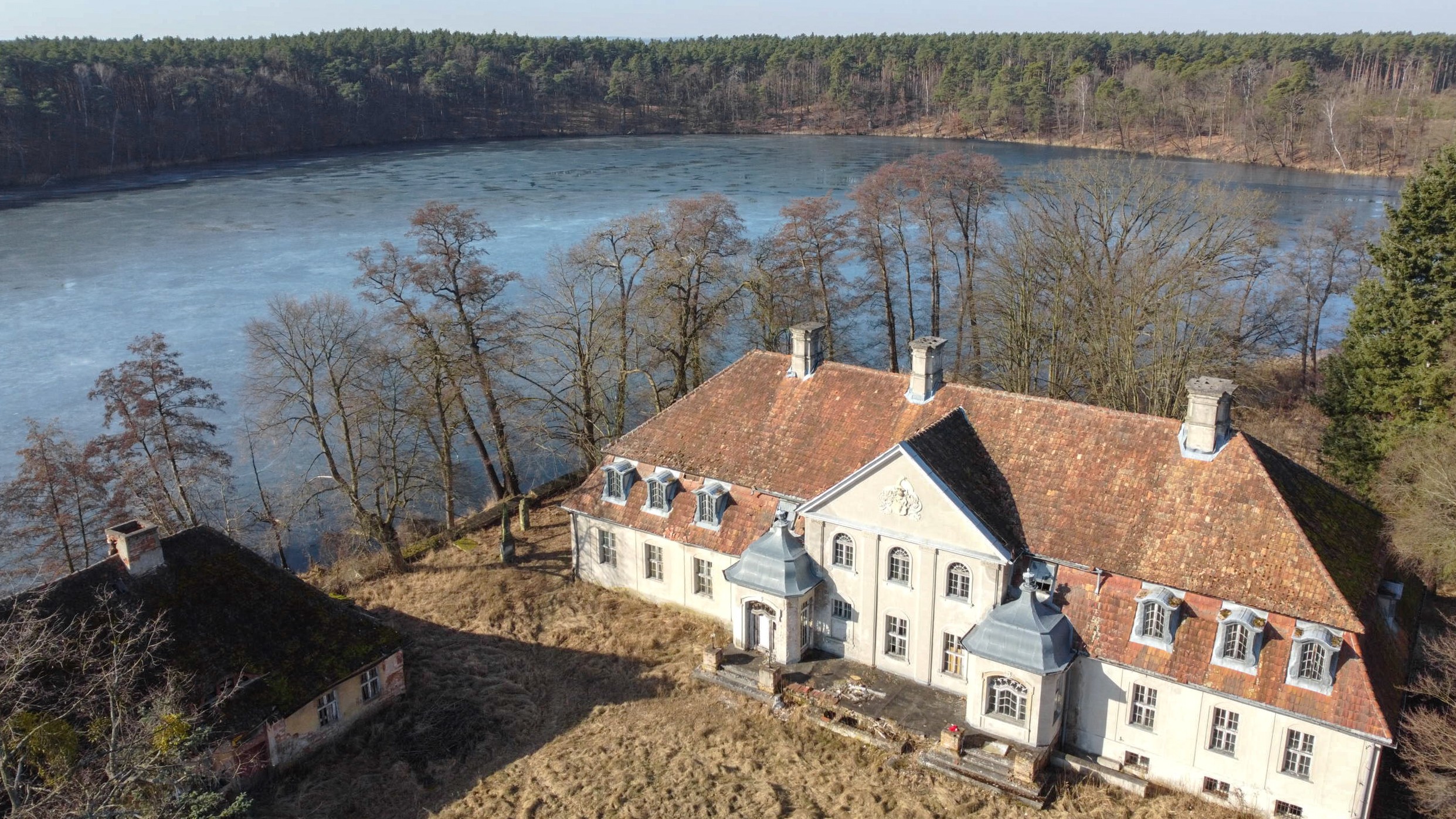 Ce manoir est situé sur une péninsule privée d’environ 30 000 m² dans la voïvodie de Lubusz, directement au bord d’un lac et entouré d’un parc historique avec des chênes et des hêtres centenaires. Ses origines remontent au XIIIᵉ siècle et différentes époques de construction sont visibles, notamment des voûtes gothiques et un portail baroque. Dans les années 1980, les plafonds et escaliers ont été rénovés en béton. Depuis, les intérieurs sont en état brut et nécessitent une rénovation complète.