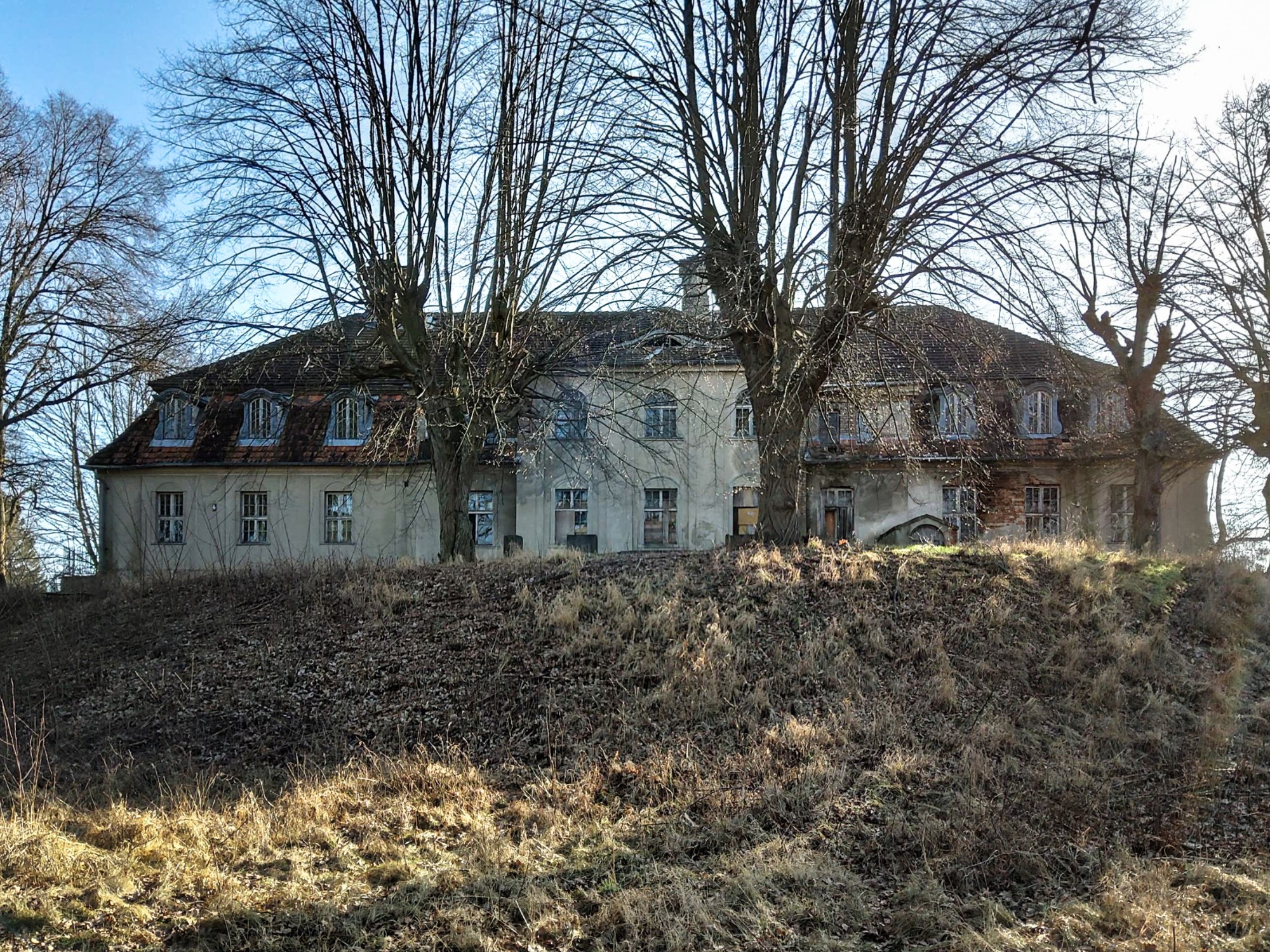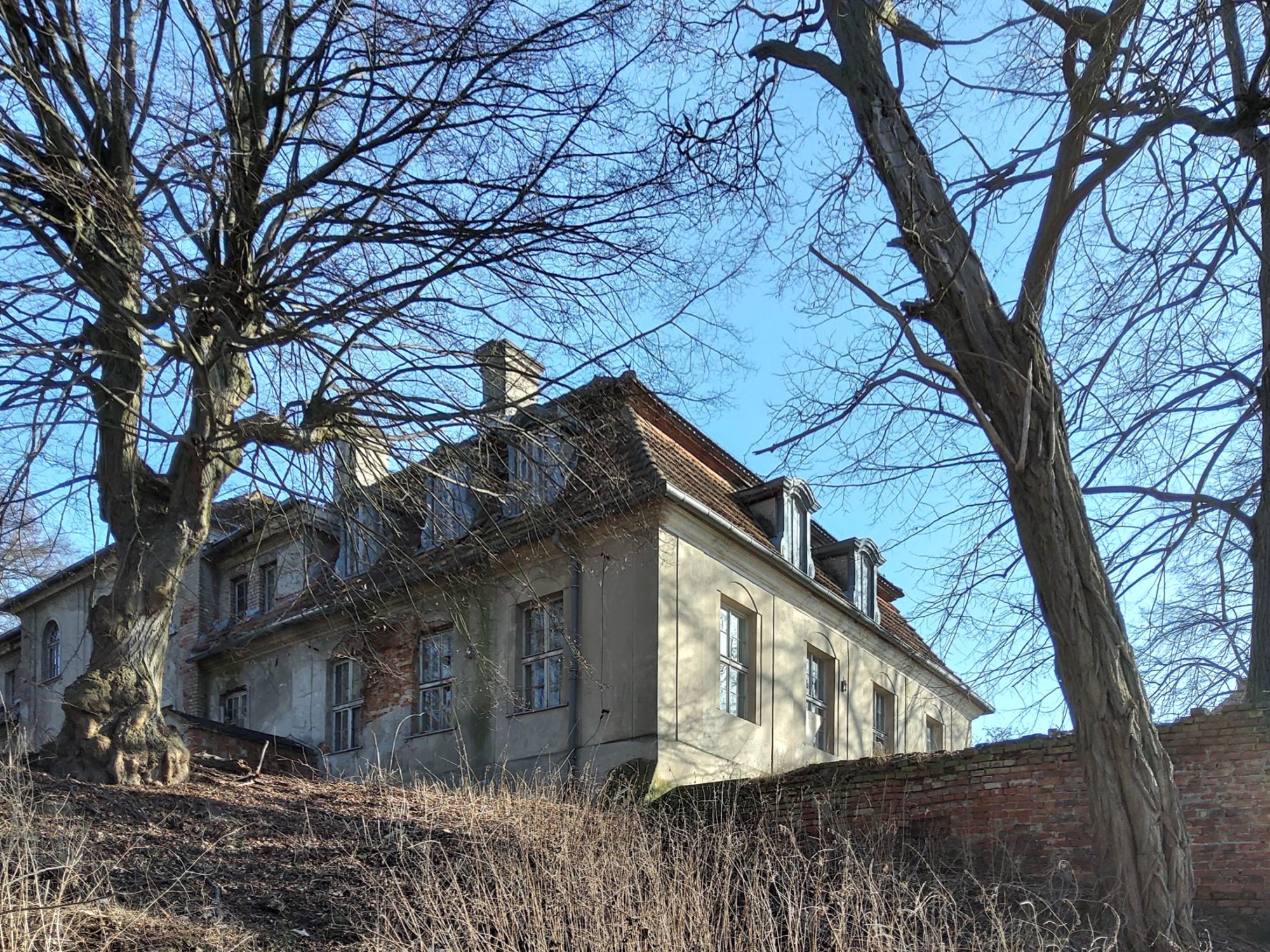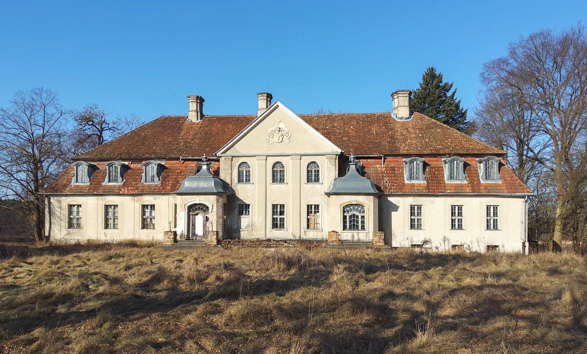 Ce manoir est situé sur une péninsule privée d’environ 30 000 m² dans la voïvodie de Lubusz, directement au bord d’un lac et entouré d’un parc historique avec des chênes et des hêtres centenaires. Ses origines remontent au XIIIᵉ siècle et différentes époques de construction sont visibles, notamment des voûtes gothiques et un portail baroque. Dans les années 1980, les plafonds et escaliers ont été rénovés en béton. Depuis, les intérieurs sont en état brut et nécessitent une rénovation complète.