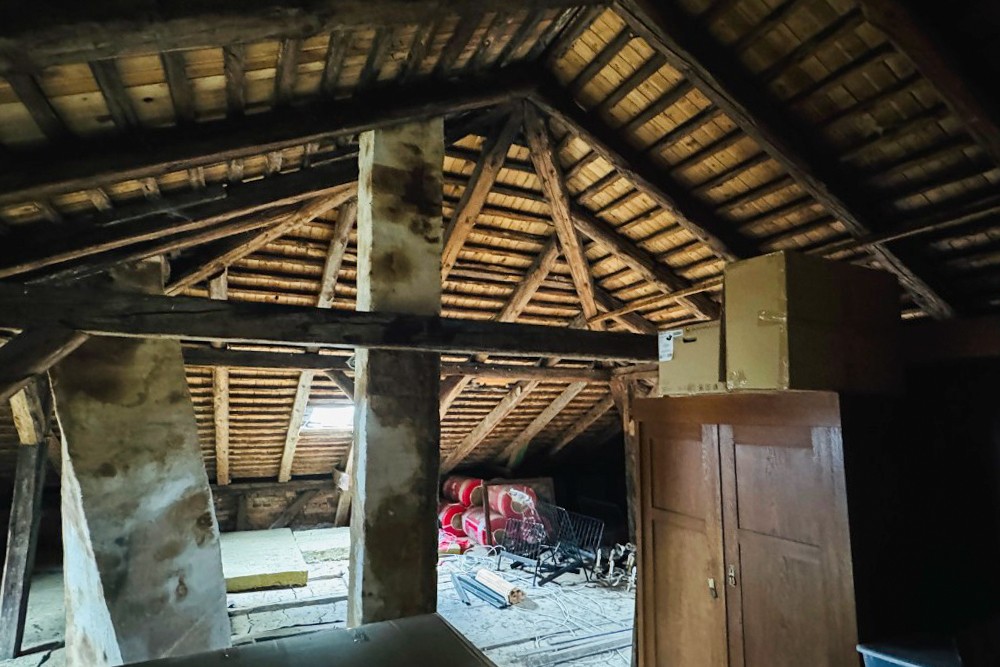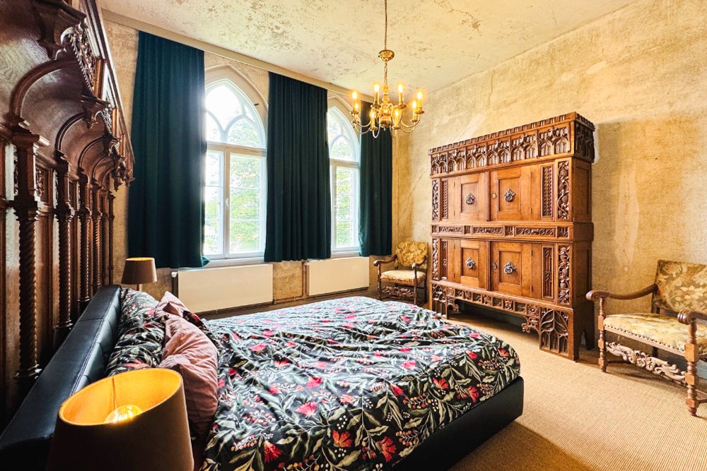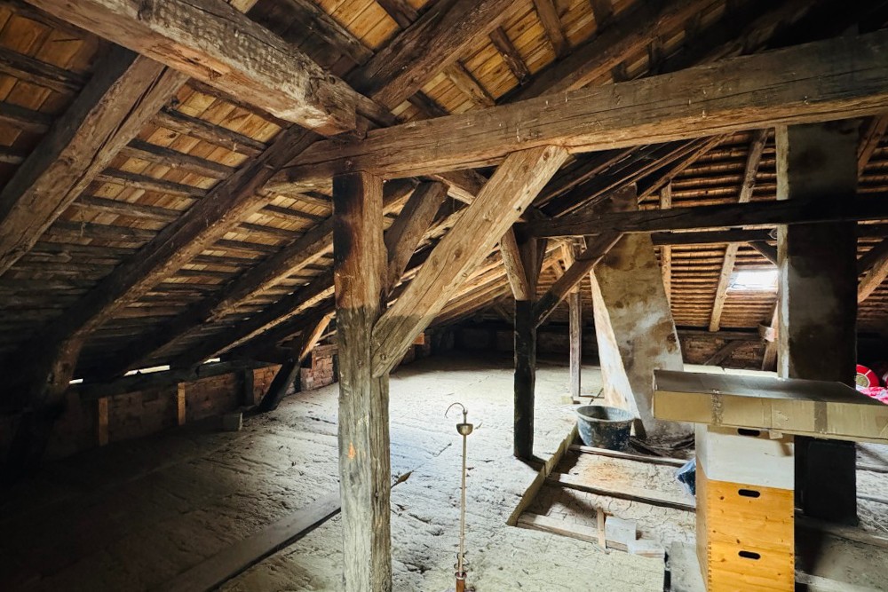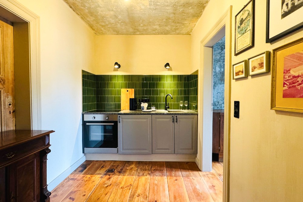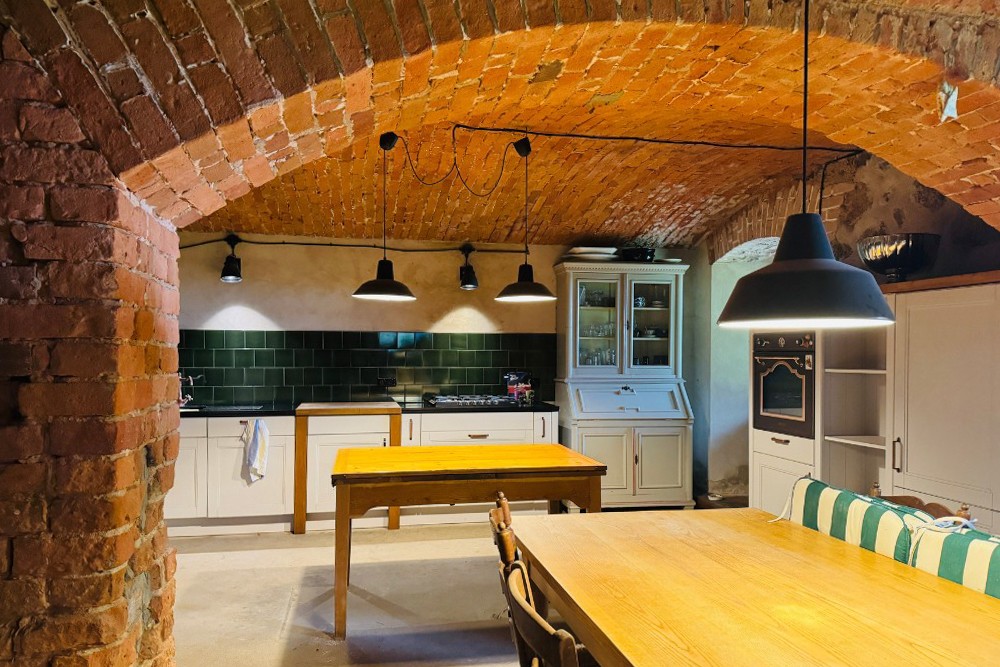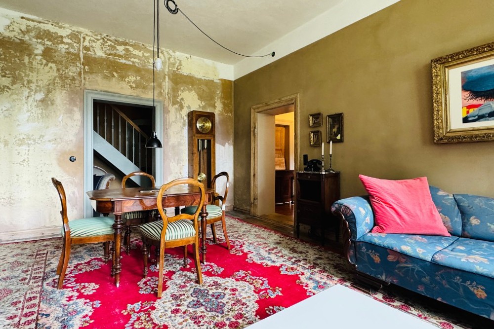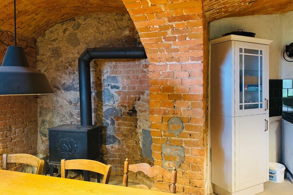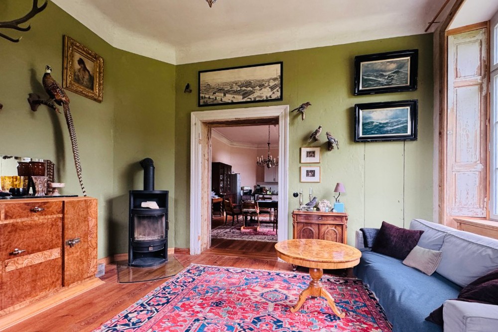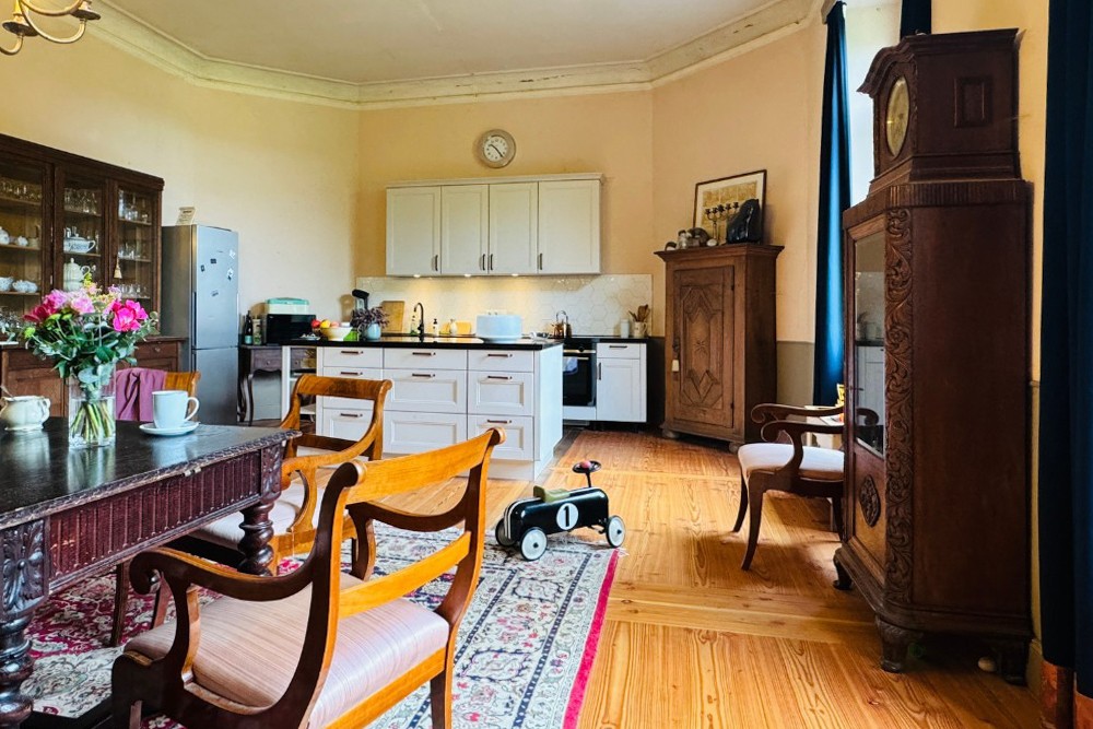 La moitié de la demeure à vendre ouvre sur un intérieur soigneusement restauré. Dans le sous-sol voûté, la cuisine historique du domaine avec son poêle en fonte reste préservée. Au rez-de-chaussée, un petit appartement pour invités avec salle de bain privative a été terminé ; à côté se trouvent la cuisine, la salle à manger et le salon, qui s’ouvrent sur une terrasse presque achevée. Au premier étage, plusieurs chambres et un espace invité indépendant sont reliés au charmant étage de la tour, actuellement utilisé comme chambre. Ce niveau offre également un large potentiel d’extension.