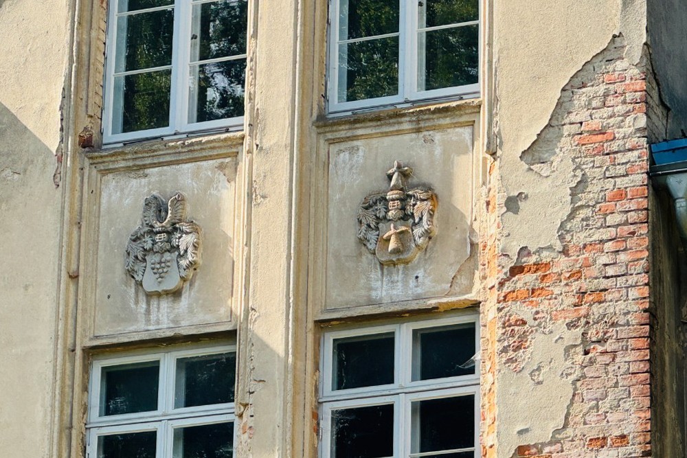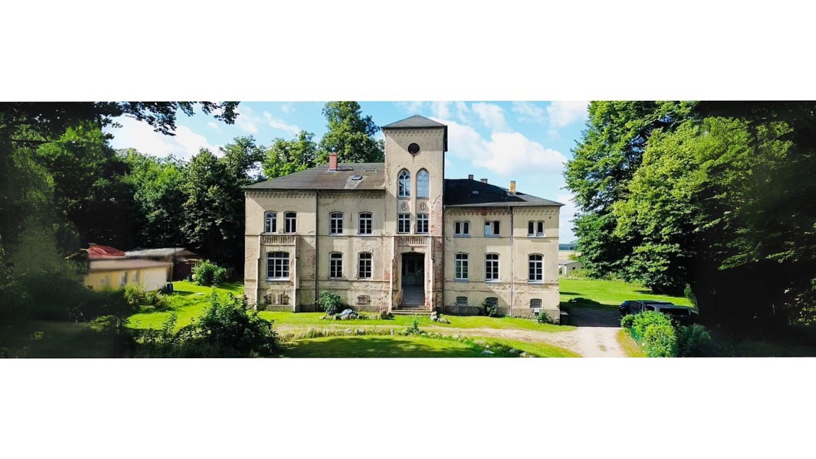 Sous le voile rouille de son histoire, la demeure de Kobrow se fait encore sentir – un bâtiment de deux étages sur un haut sous-sol, construit vers 1860 dans le style néo-gothique. Une tour rectangulaire de trois étages avec toit en forme de tente et horloge s’élève légèrement décalée par rapport à la façade. Au-dessus de l’entrée, deux blasons – celui de la famille von Bülow et celui de la famille von Zeppelin – témoignent d’une longue succession de propriétaires depuis le XVIIe siècle jusqu’à la répartition des terres après 1932.