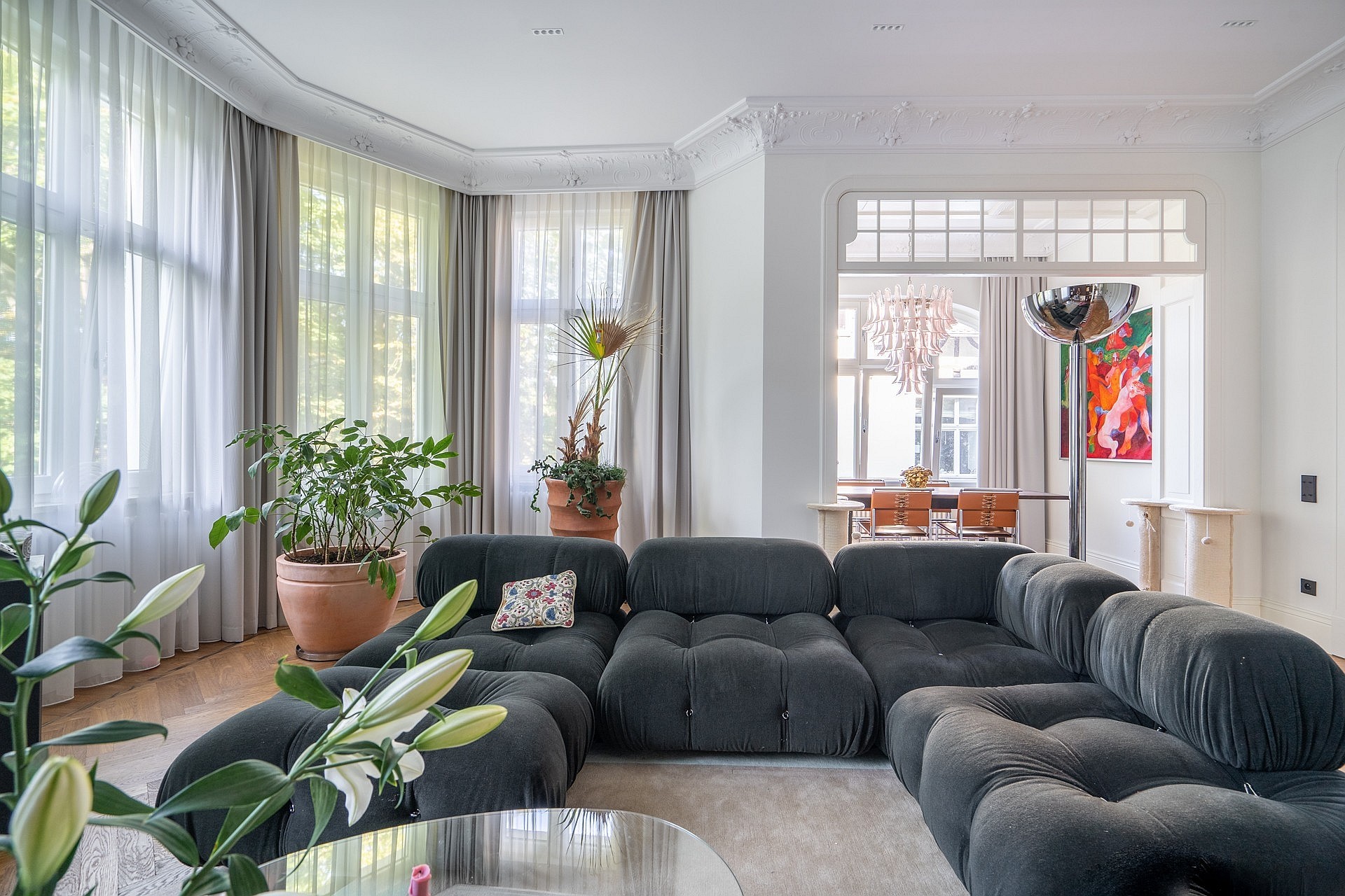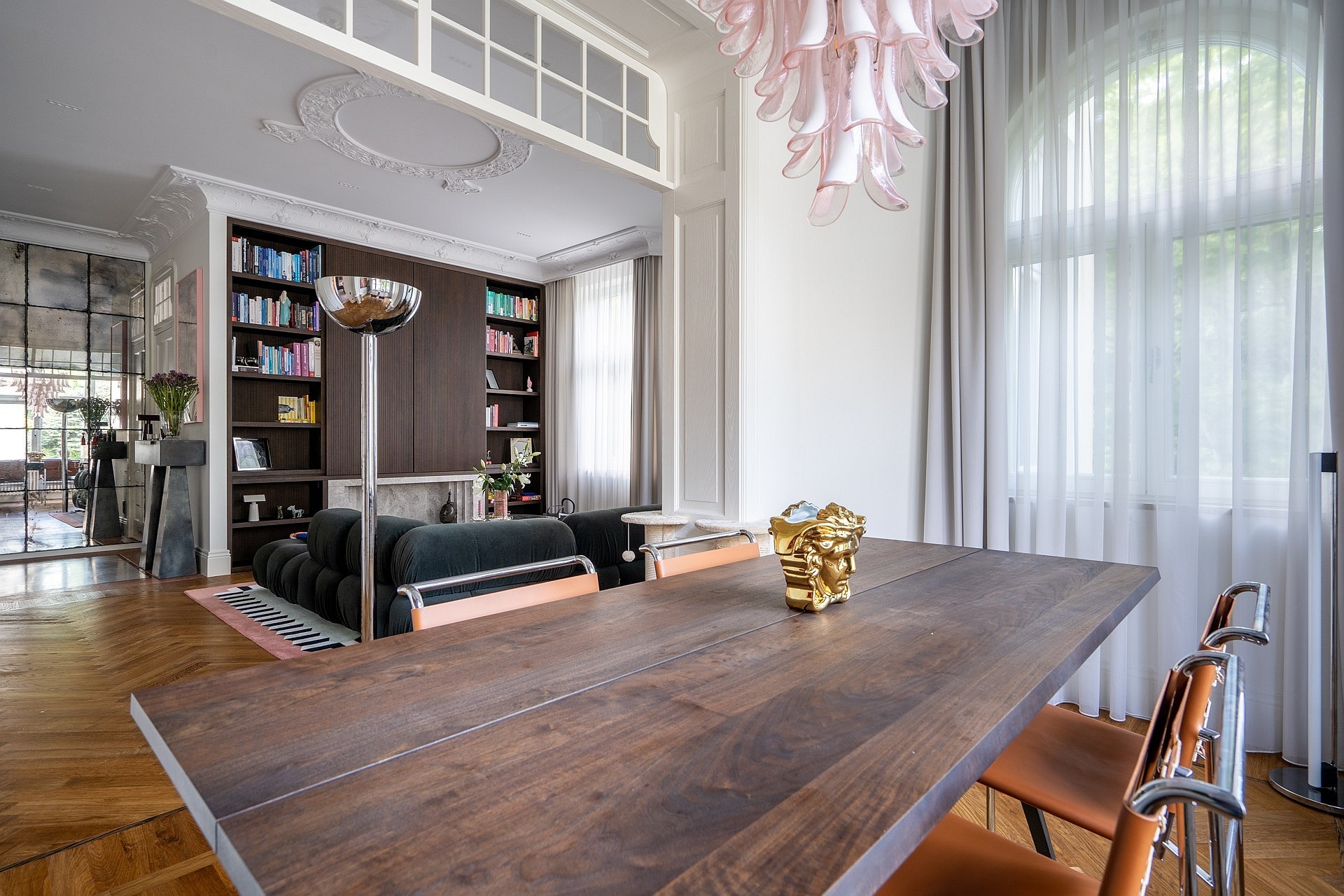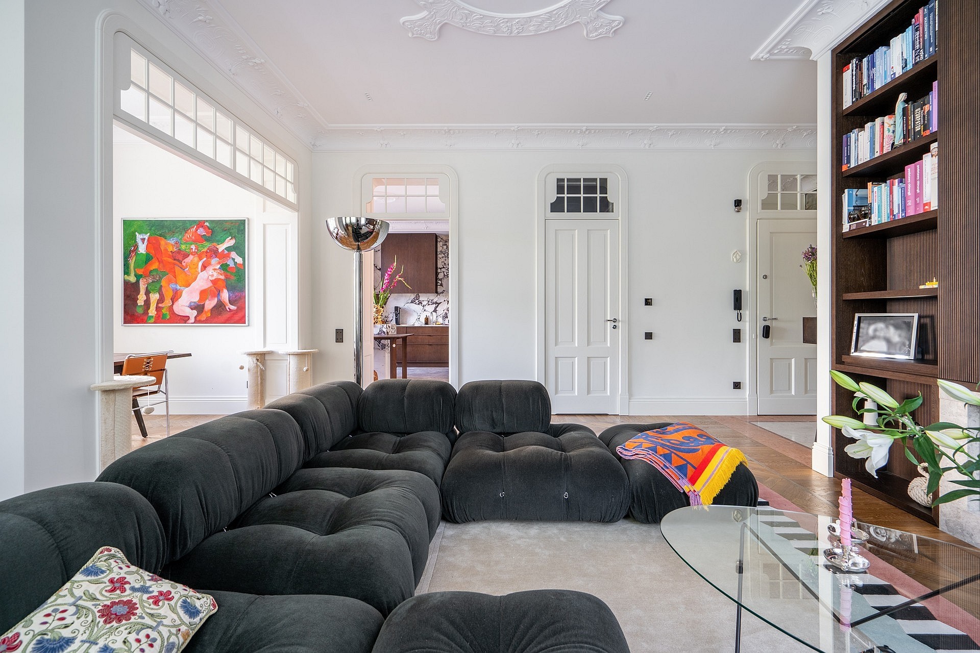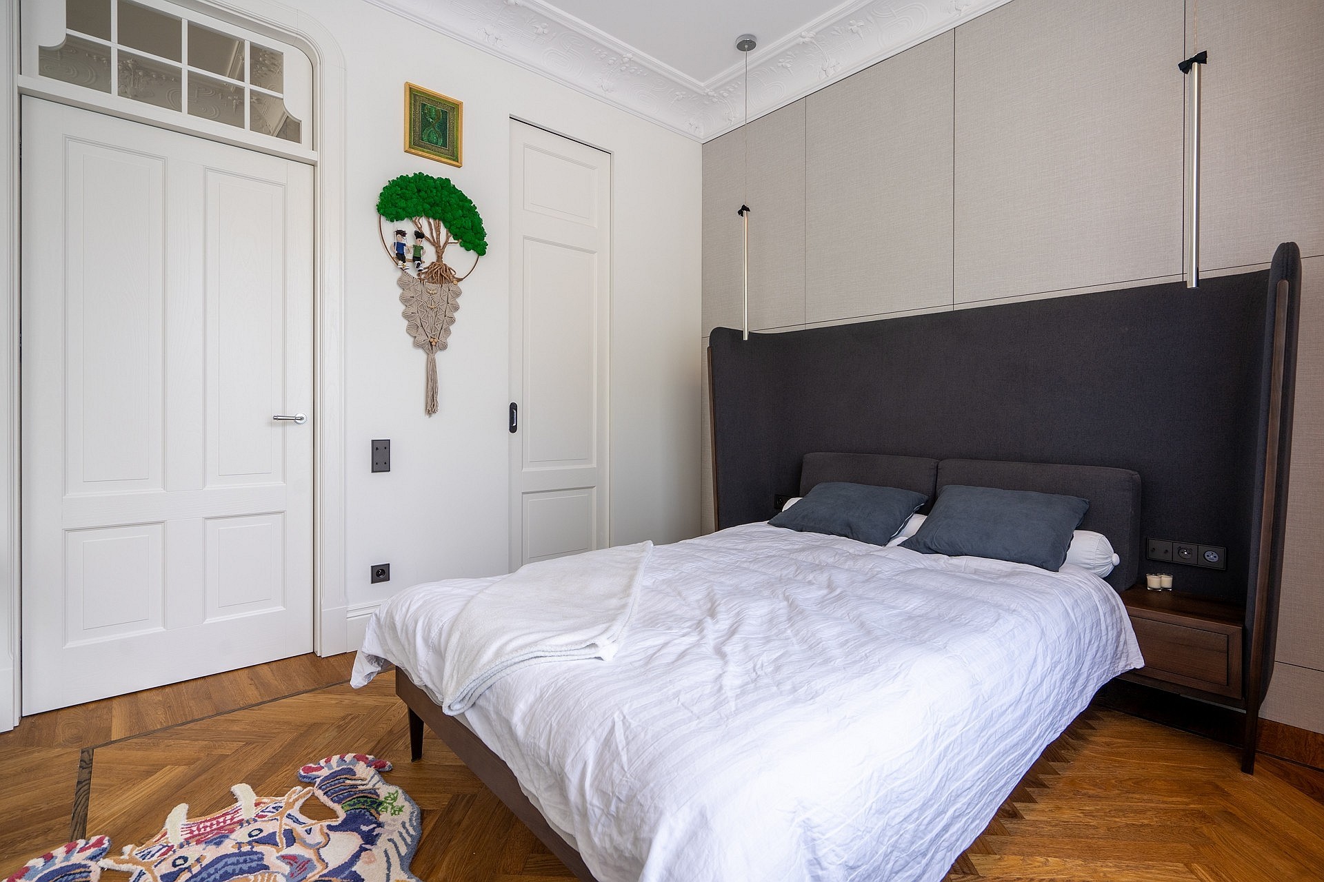 Parquet en chêne d’origine en motif chevron français, moulures décoratives sur les murs et les plafonds, mobilier sur mesure. Hauteur sous plafond supérieure à trois mètres. Grandes fenêtres apportant une excellente luminosité naturelle.