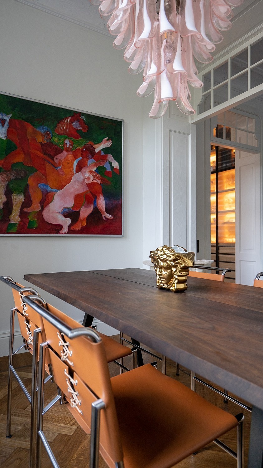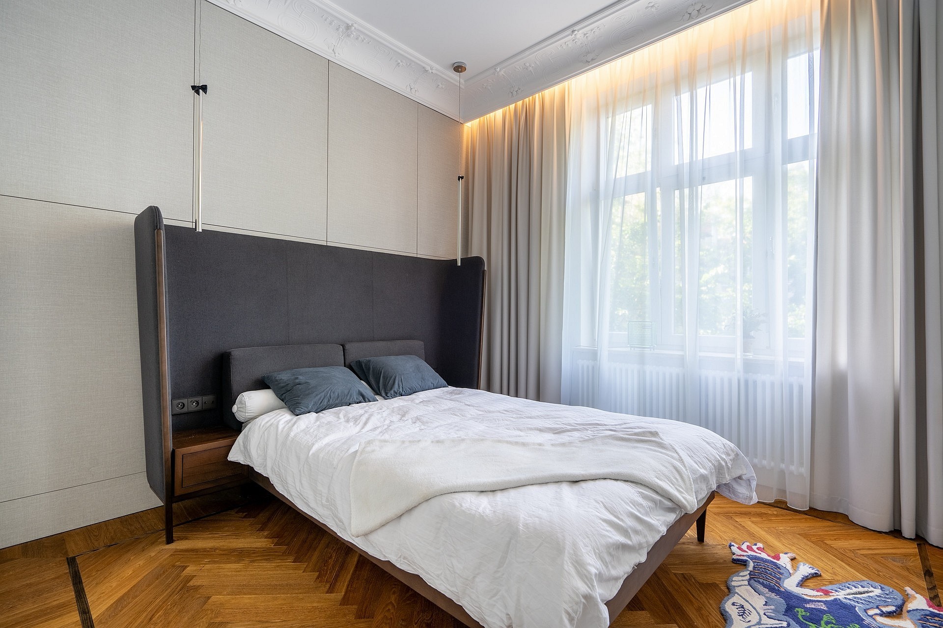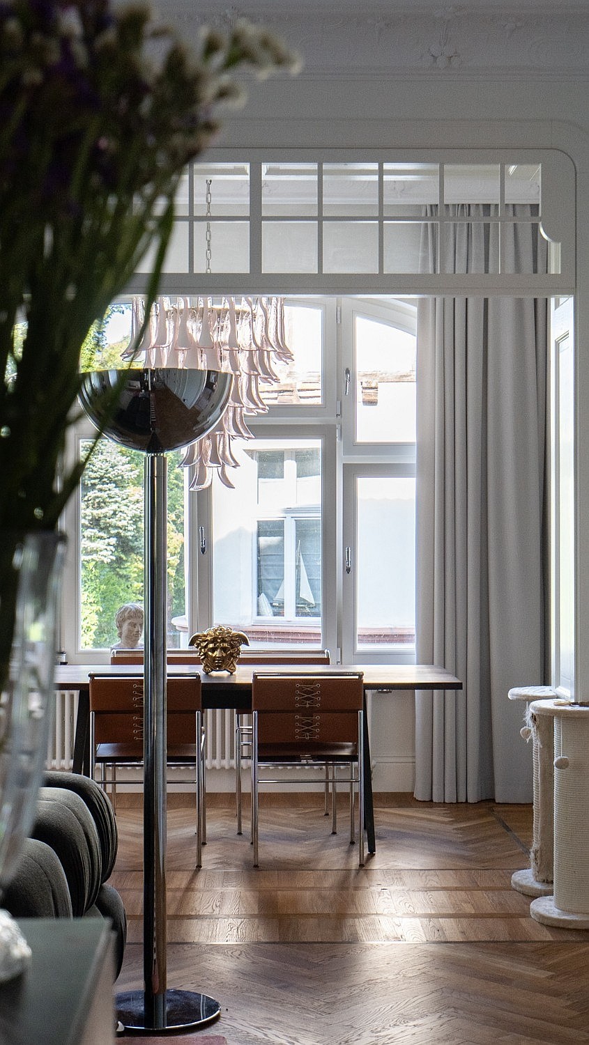 Parquet en chêne d’origine en motif chevron français, moulures décoratives sur les murs et les plafonds, mobilier sur mesure. Hauteur sous plafond supérieure à trois mètres. Grandes fenêtres apportant une excellente luminosité naturelle.