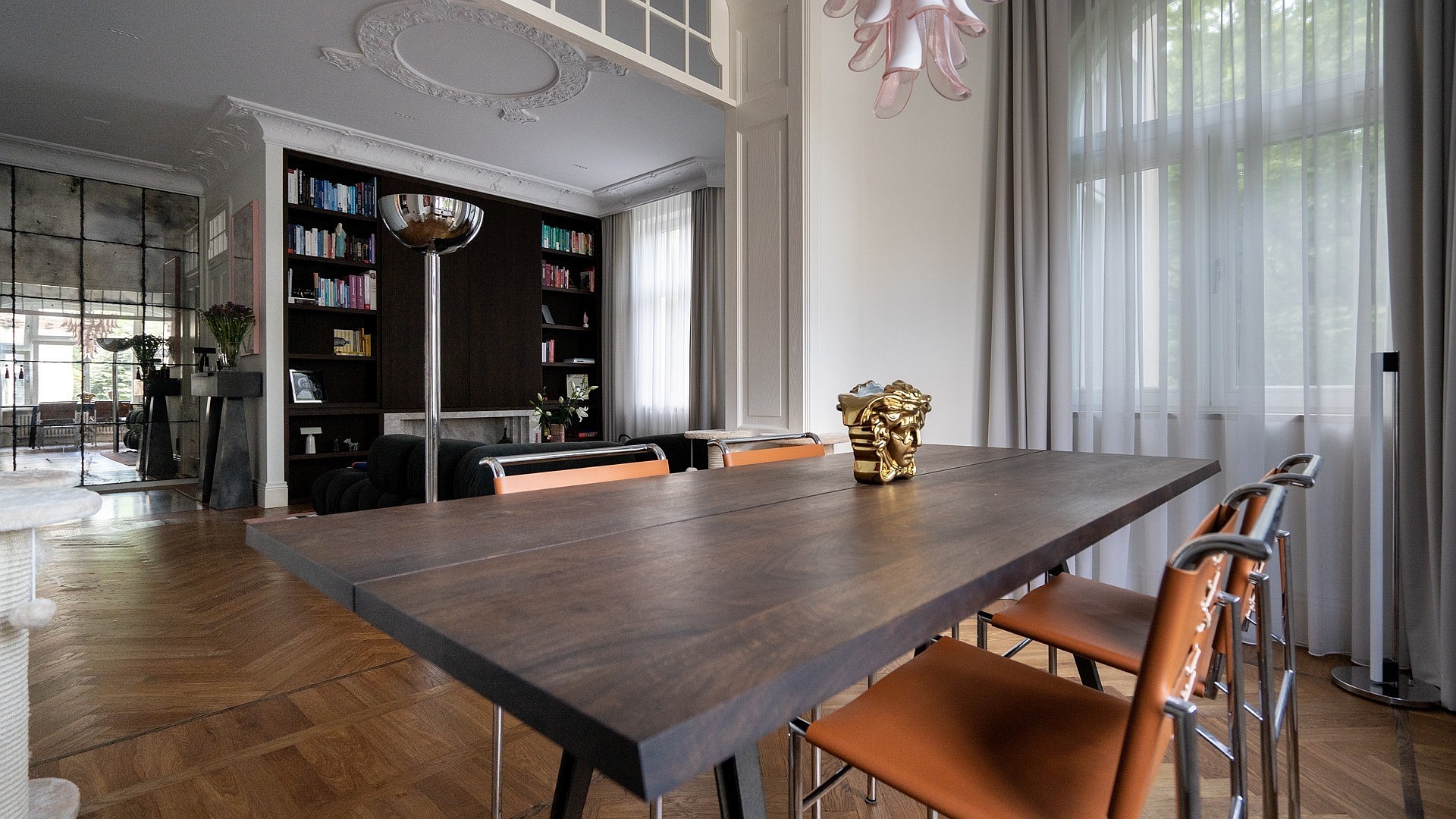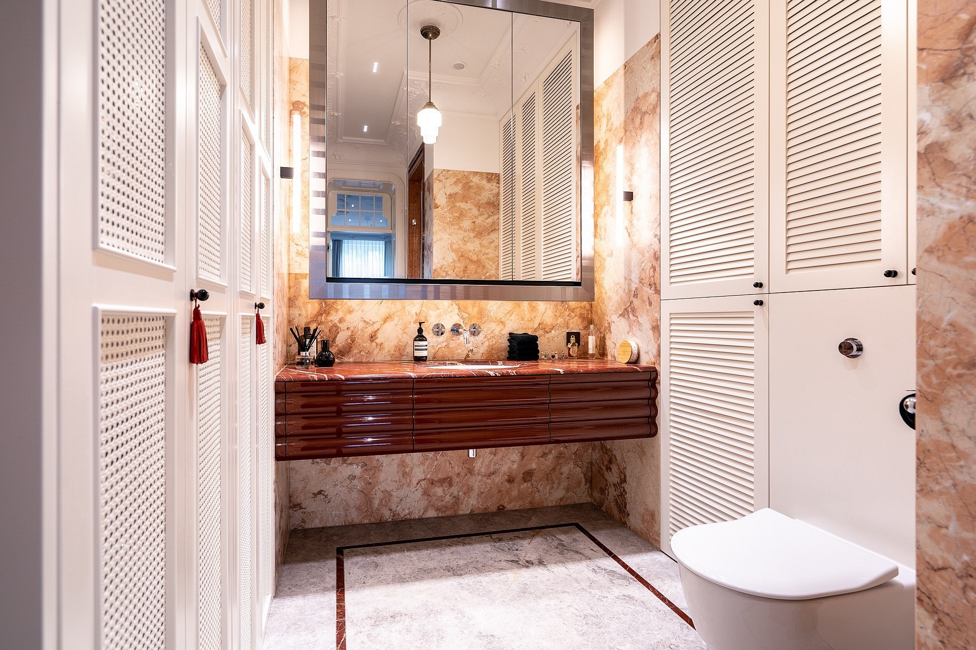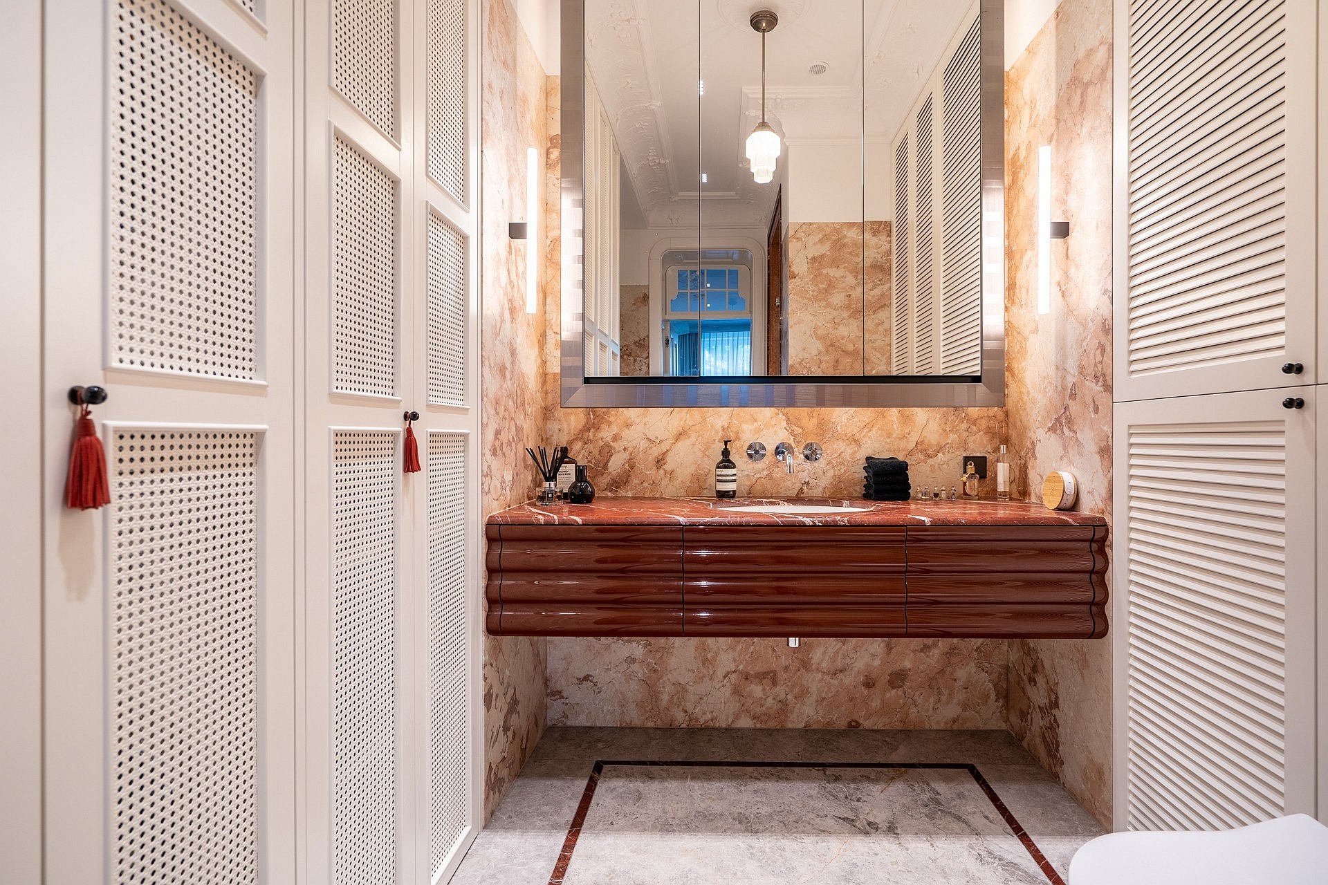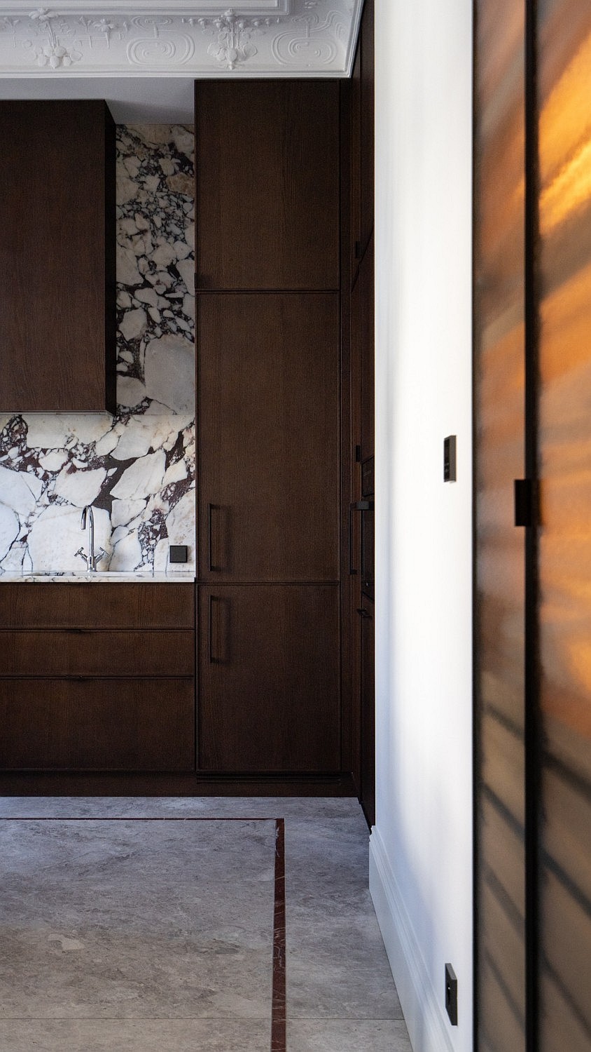 Parquet en chêne d’origine en motif chevron français, moulures décoratives sur les murs et les plafonds, mobilier sur mesure. Hauteur sous plafond supérieure à trois mètres. Grandes fenêtres apportant une excellente luminosité naturelle.