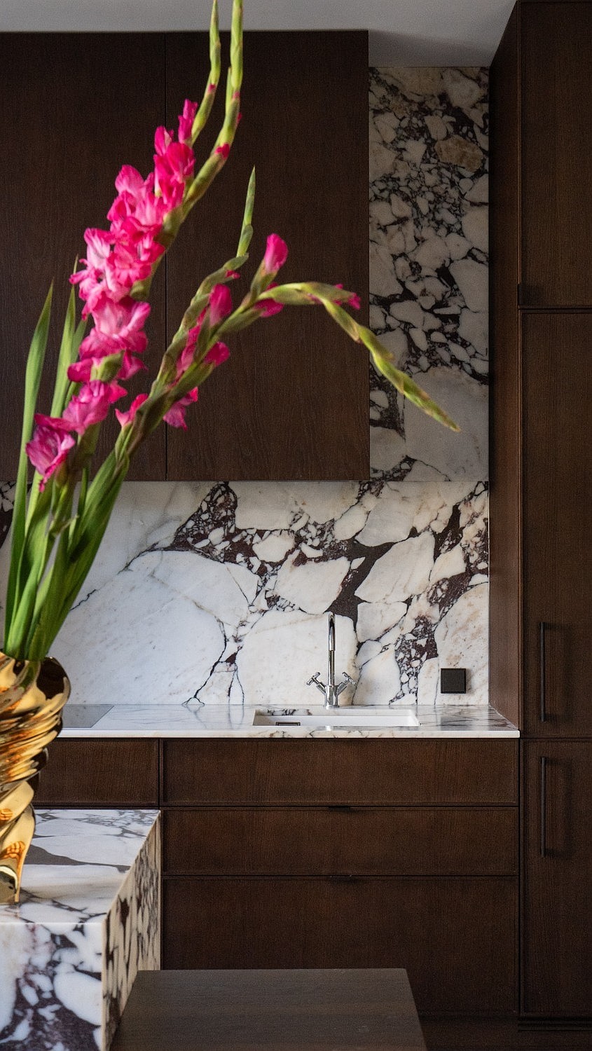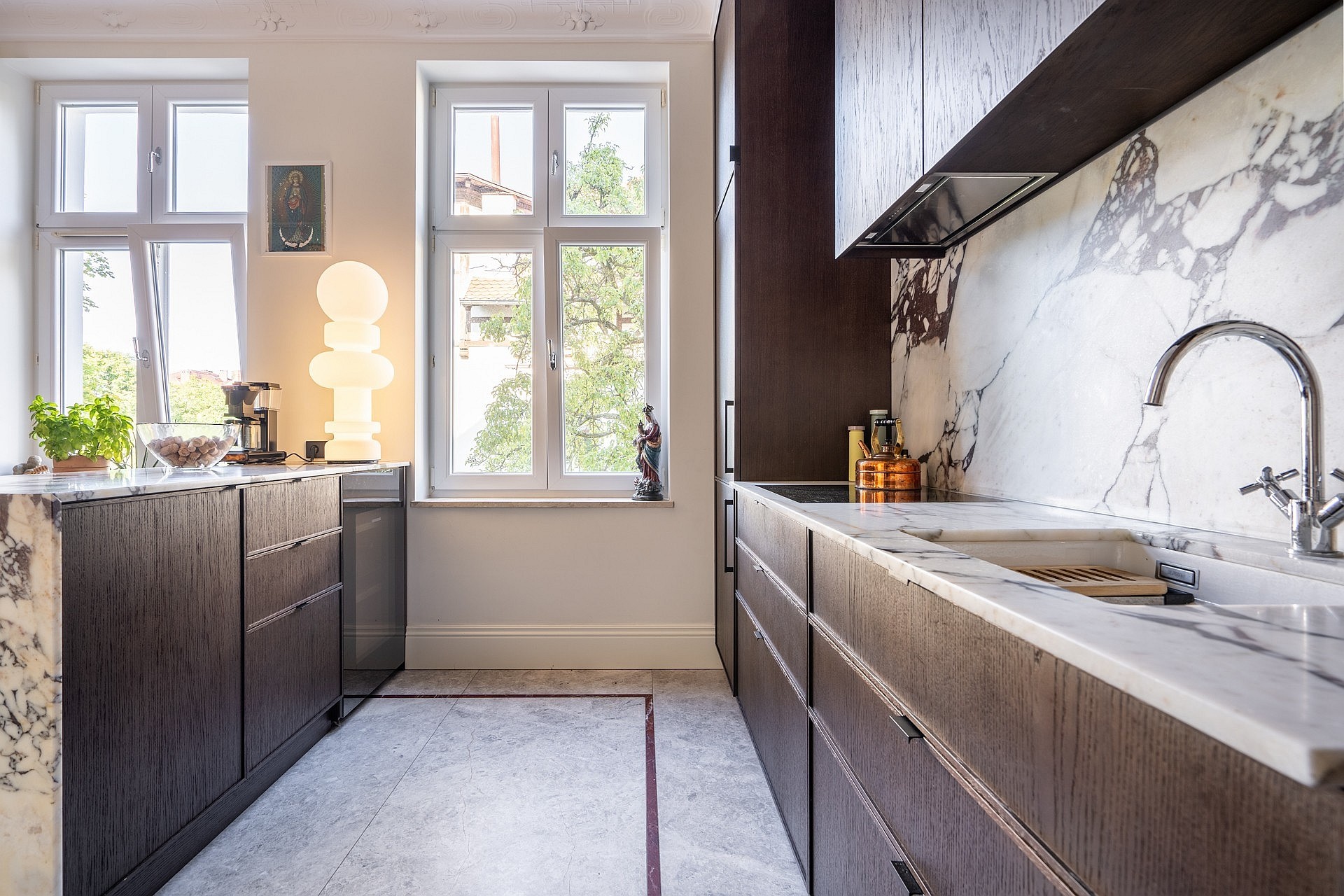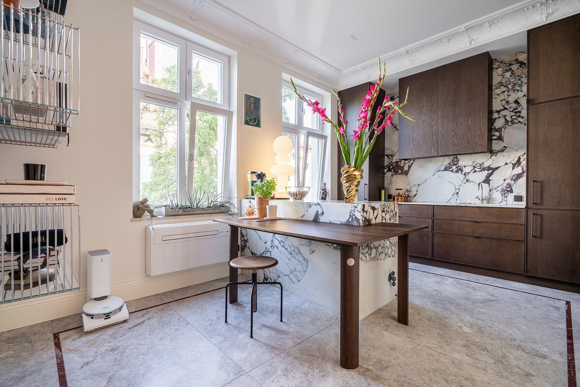 Le séjour est divisé en coin salon et espace cuisine-salle à manger avec table pour quatre à six personnes. La cuisine est équipée de meubles foncés et d’un plan de travail en pierre ; équipements : plaque à induction, lave-vaisselle, réfrigérateur-congélateur, four et hotte aspirante. Accès depuis le séjour à la véranda vitrée exposée au soleil.