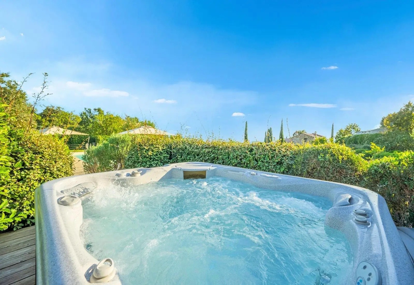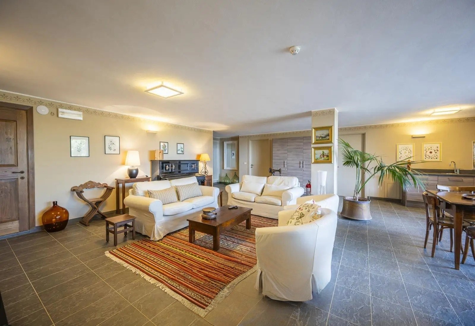 À l’extérieur, le domaine de 1,5 hectare propose jardins en terrasses, piscine panoramique avec solarium, jacuzzi, sauna finlandais et salle de sport. Des allées serpentent à travers les vergers jusqu’à la cabane et au parking privé. Un cave à vin est disponible pour la dégustation ou le stockage.