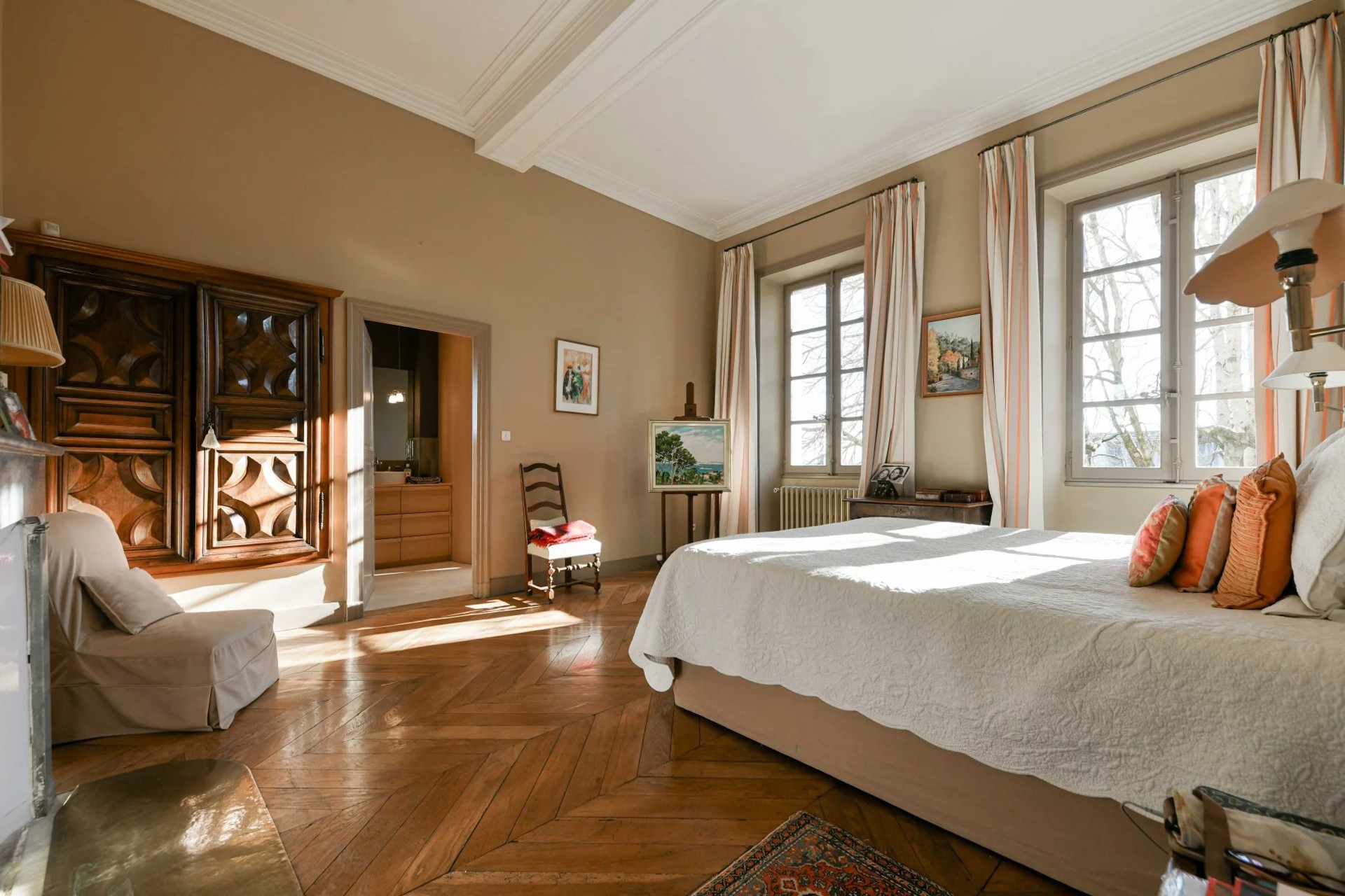 Au premier étage, le palier dessert sur sa droite la chambre principale avec salle de bains, ainsi que deux autres chambres, chacune avec salle de bains, et un bureau de l'autre côté du palier.