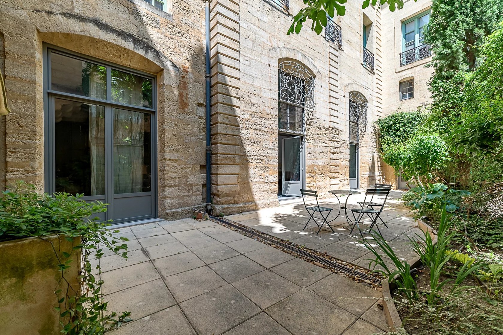 L'appartement dispose d'une entrée indépendante et s'ouvre sur un salon de 64 m² largement ouvert sur le jardin. La cuisine voûtée de style avignonnais comprend un espace dînatoire avec cheminée en pierre et four à pain, également orientée vers le jardin.
