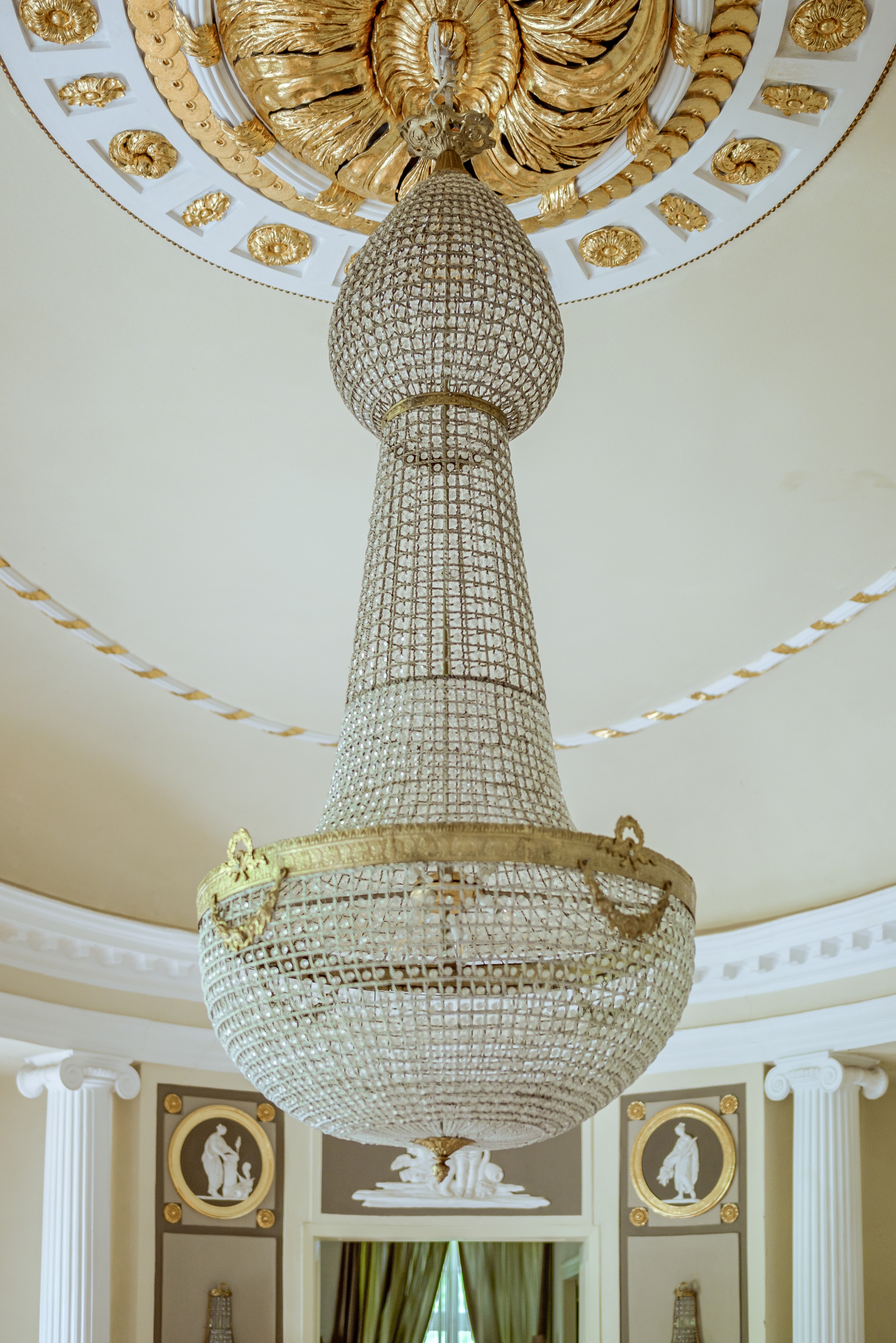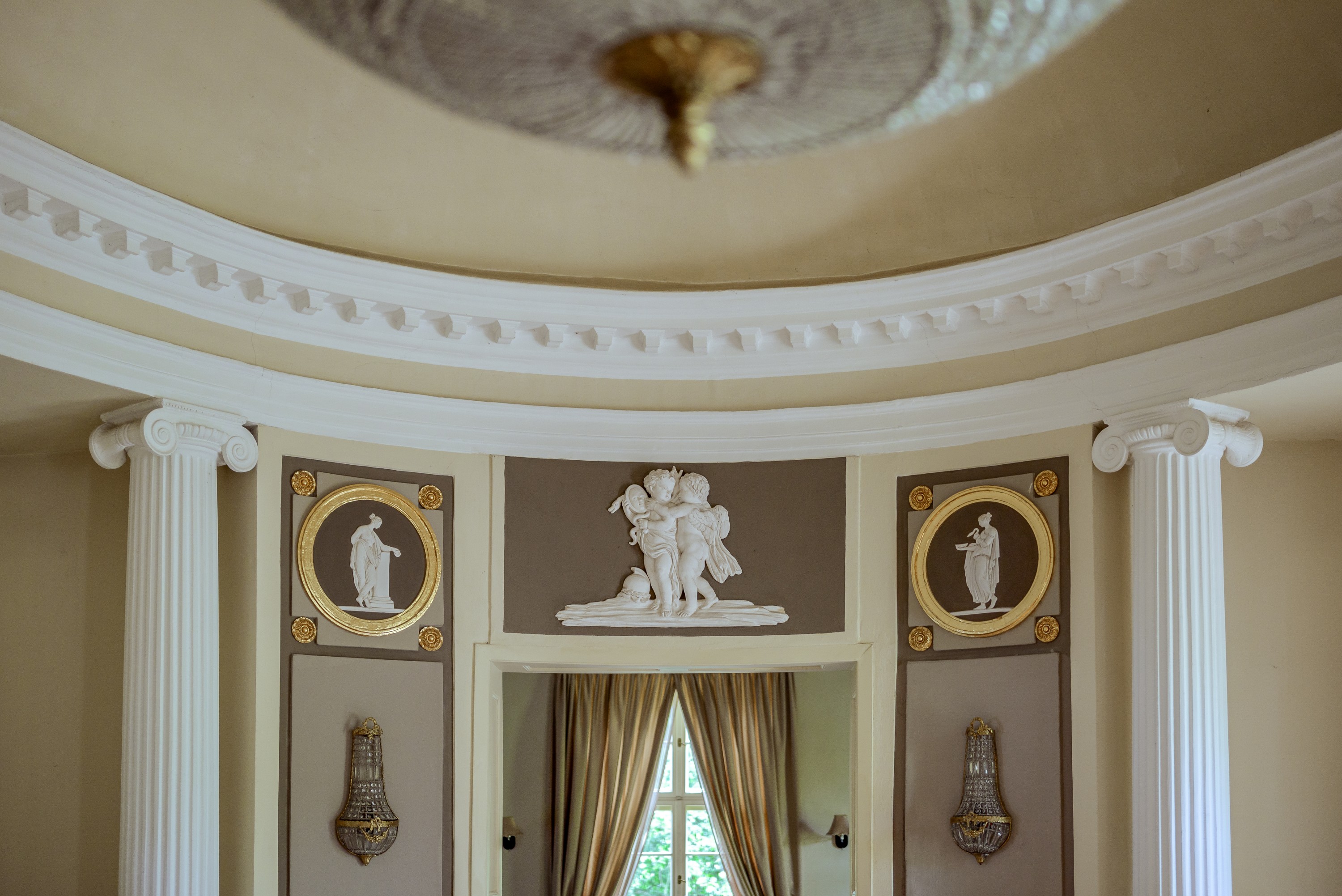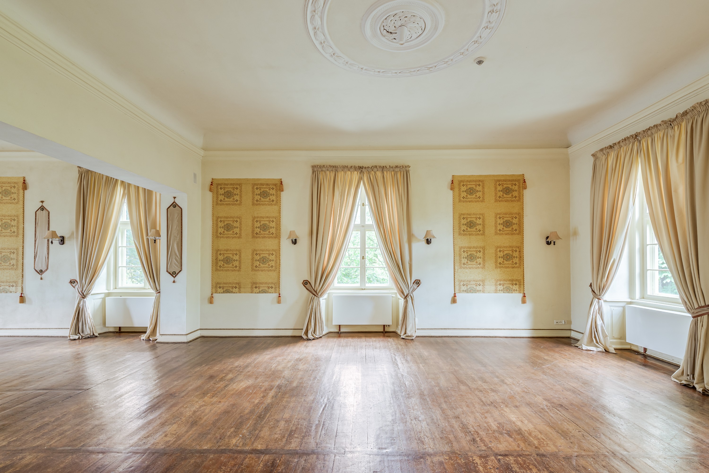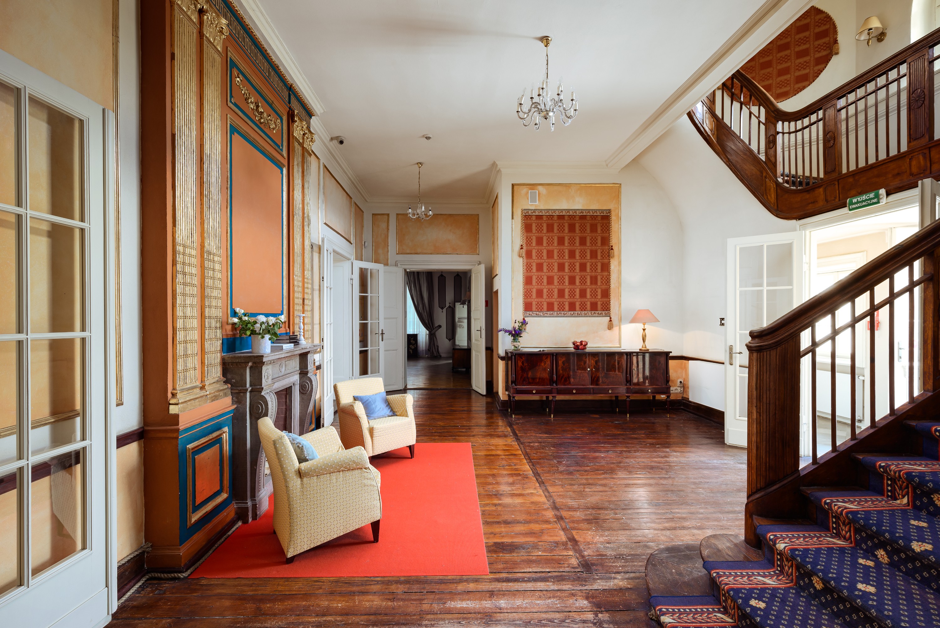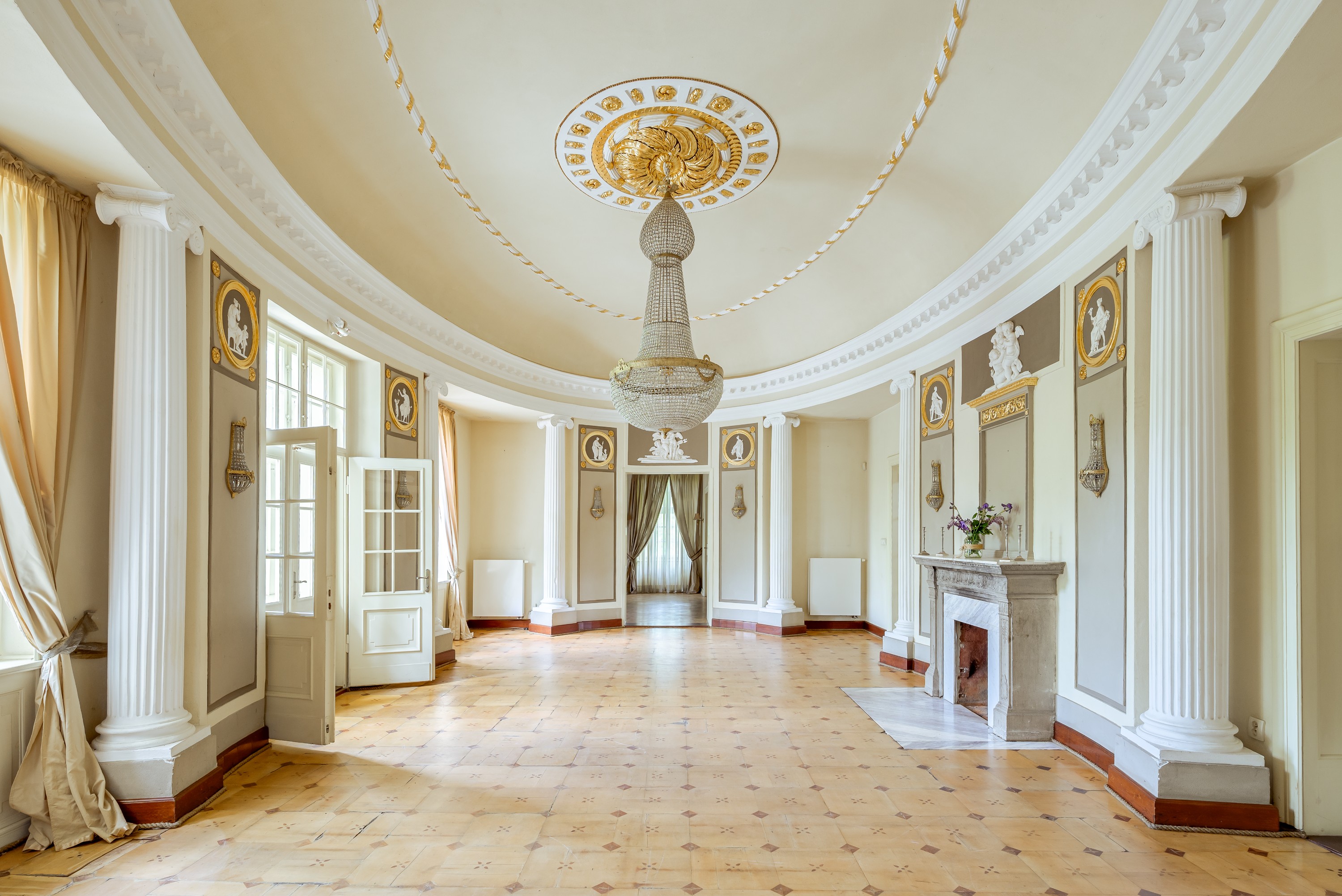 Le rez-de-chaussée de l'édifice est très représentatif avec une salle ovale magnifiquement conservée et restaurée, dont les murs sont ornés de riches stucs néoclassiques, probablement réalisés par le célèbre artiste de Wrocław, Hans Peter Echtler. Les médaillons et les supraportes visibles sur les murs représentent des personnifications de la force, de la fidélité, du courage, de la santé, de la paix et des scènes symboliques. La salle entière est couronnée par une voûte en miroir en forme d'ellipse soutenue par des colonnes ioniques décoratives. Dans cette salle se trouvent également une cheminée néoclassique de 1919 et un sol en mosaïque de bois datant du XVIIIe siècle, qui nécessite des travaux de rénovation.