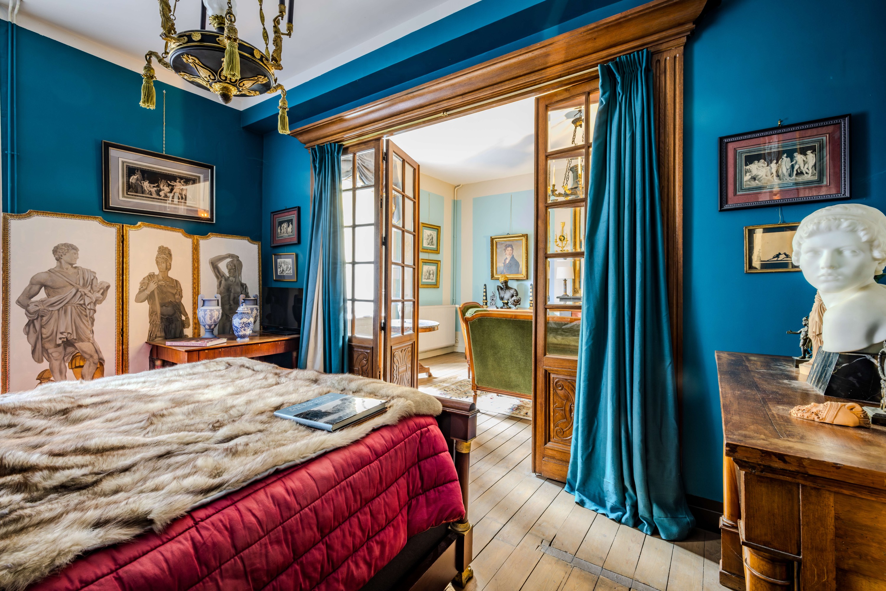 L’étage comprend trois chambres avec leurs salles de bain et leur wc respectifs. Les sols comportent des parquets en pitchpin. Une quatrième chambre, dépourvue de salle de bain complète cet étage. Cette dernière pièce comporte un petit salon séparé d’une alcôve par un portique en forme de baie serlienne, et un ravissant boudoir servant de dressing.