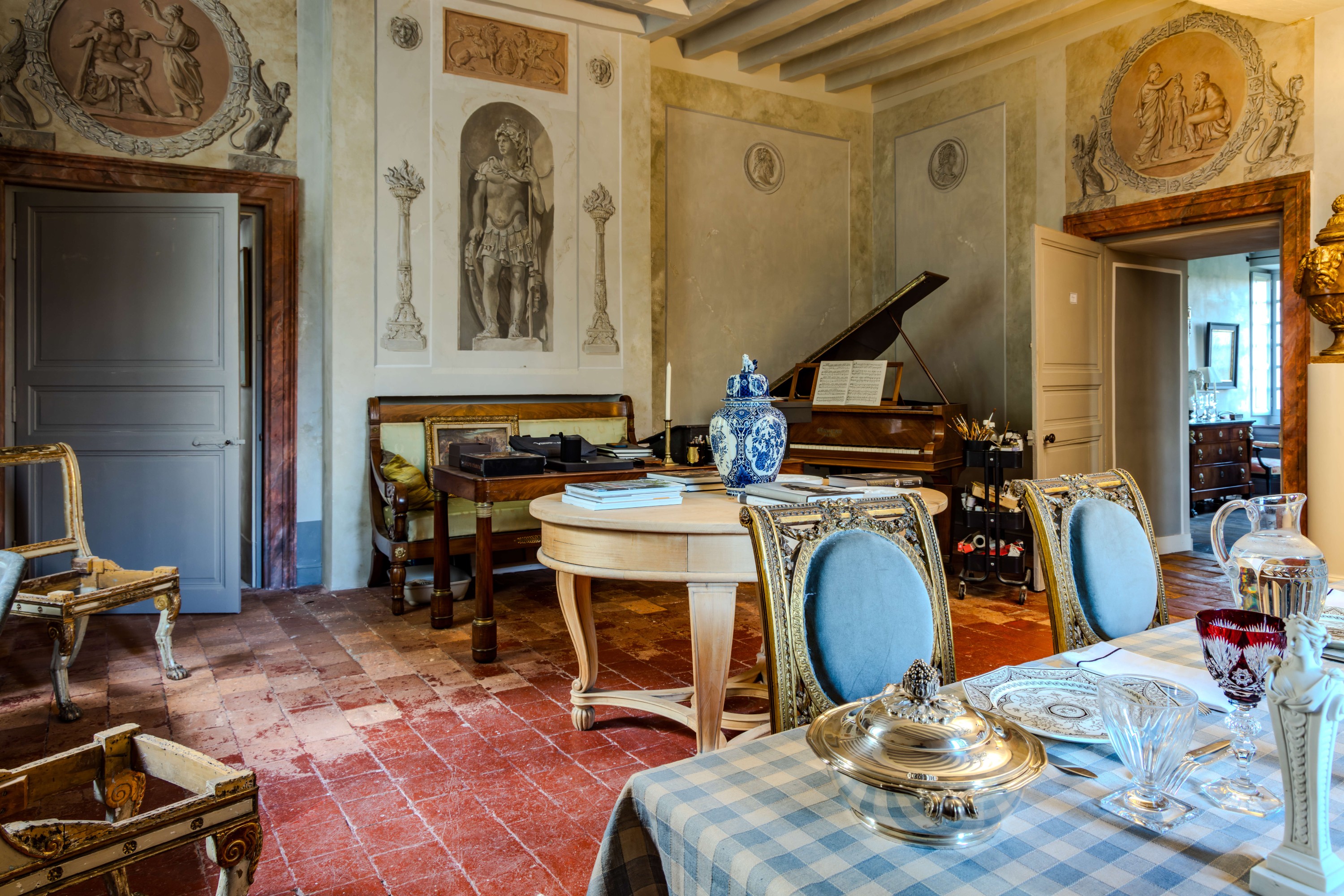 Le salon de musique est une grande pièce à la hauteur sous plafond confortable, servant parfois de salle à manger d’apparat. Le plafond à la française rappelle ceux de la fin de la Renaissance et du début du XVIIe siècle. Les murs reçoivent un décor peint d’inspiration néoclassique imitant différentes variété de marbre. Des médaillons peints représentent des scènes mythologiques à la façon de bas-reliefs. Le sol est recouvert de carreaux de terre cuite du XVIIIe siècle.
