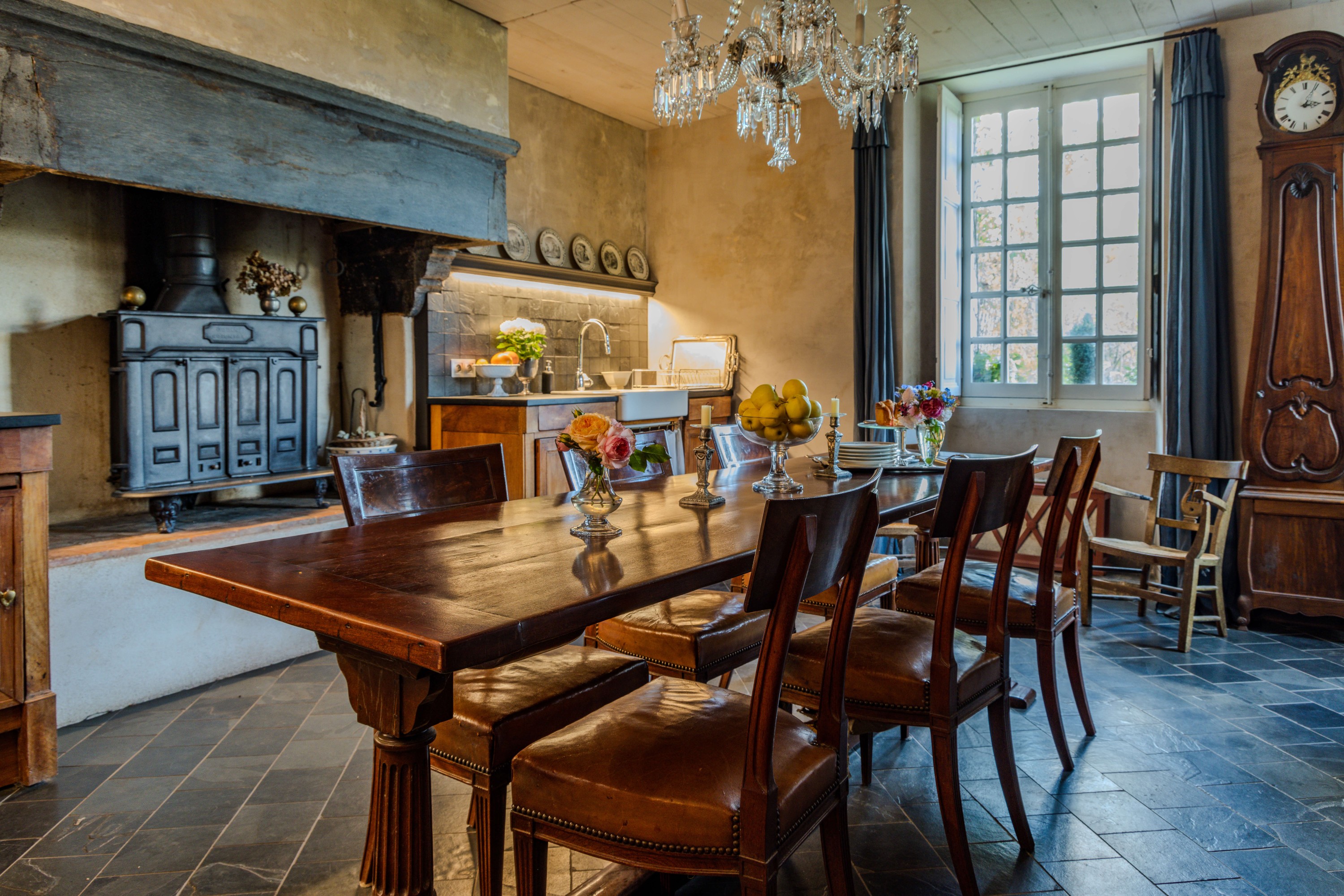 La cuisine présente un volume généreux permettant d’accueillir une table de grand format, idéale pour les repas conviviaux. Le plafond est habillé de bois peint. Le sol est également recouvert d’ardoise ainsi que les plans de travail et les crédences. Une ancienne cheminée à hotte droite rappelle la fonction primitive de la pièce, fonction demeurée inchangée. Les éléments du confort moderne s’intègrent subtilement dans cet ensemble harmonieux.