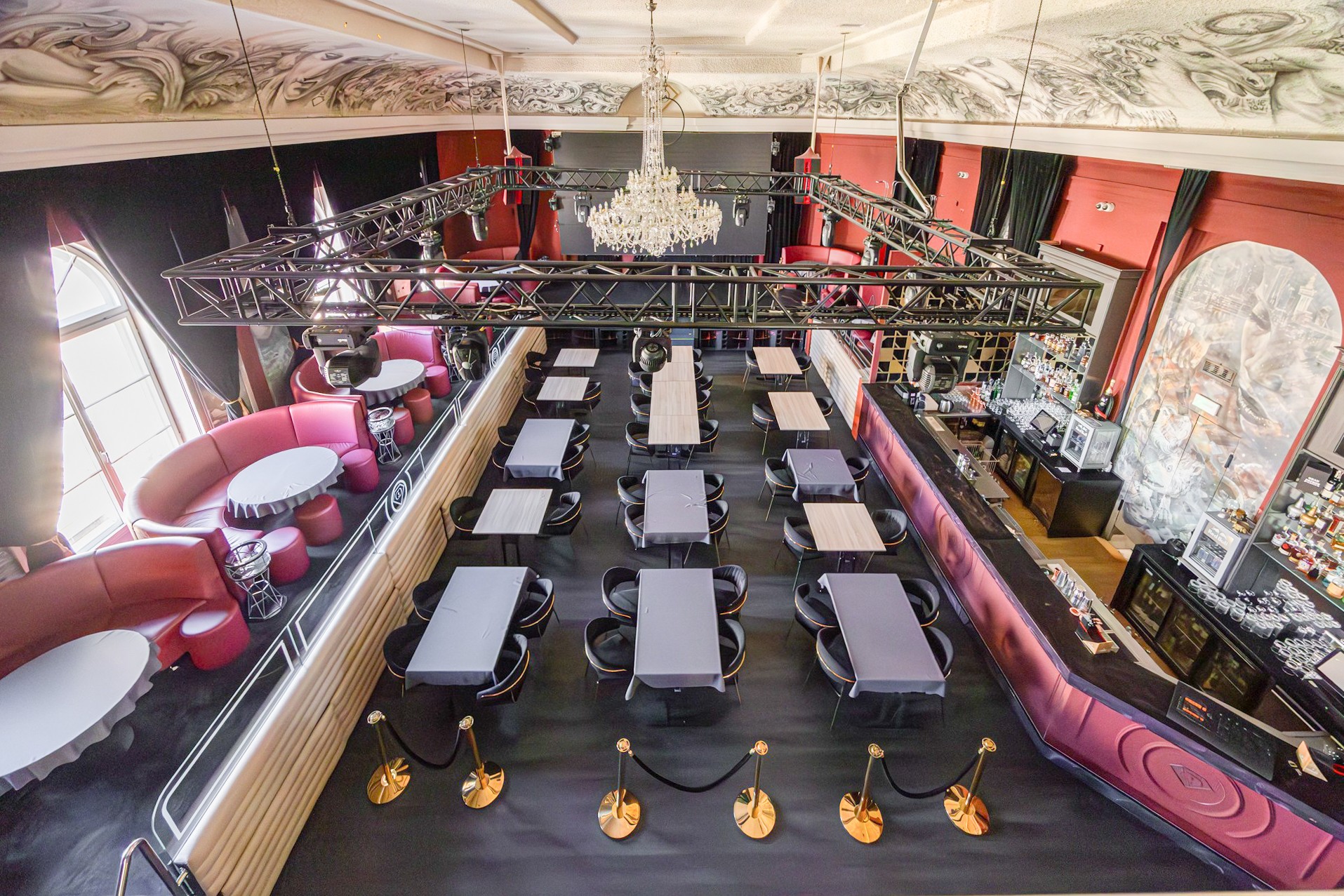 2e étage : espace événementiel (ancienne salle de bal), vestiaires, bar, toilettes dames, toilettes hommes, circulations.