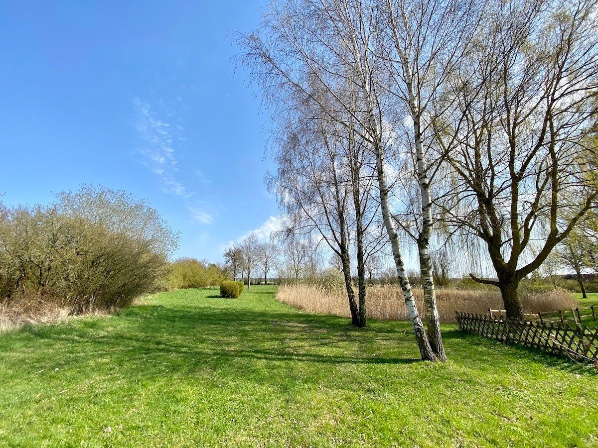 Au bord de la propriété de 7000 mètres carrés se trouve un petit étang. En raison de sa situation à la limite du village, on a une vue étendue sur les champs.