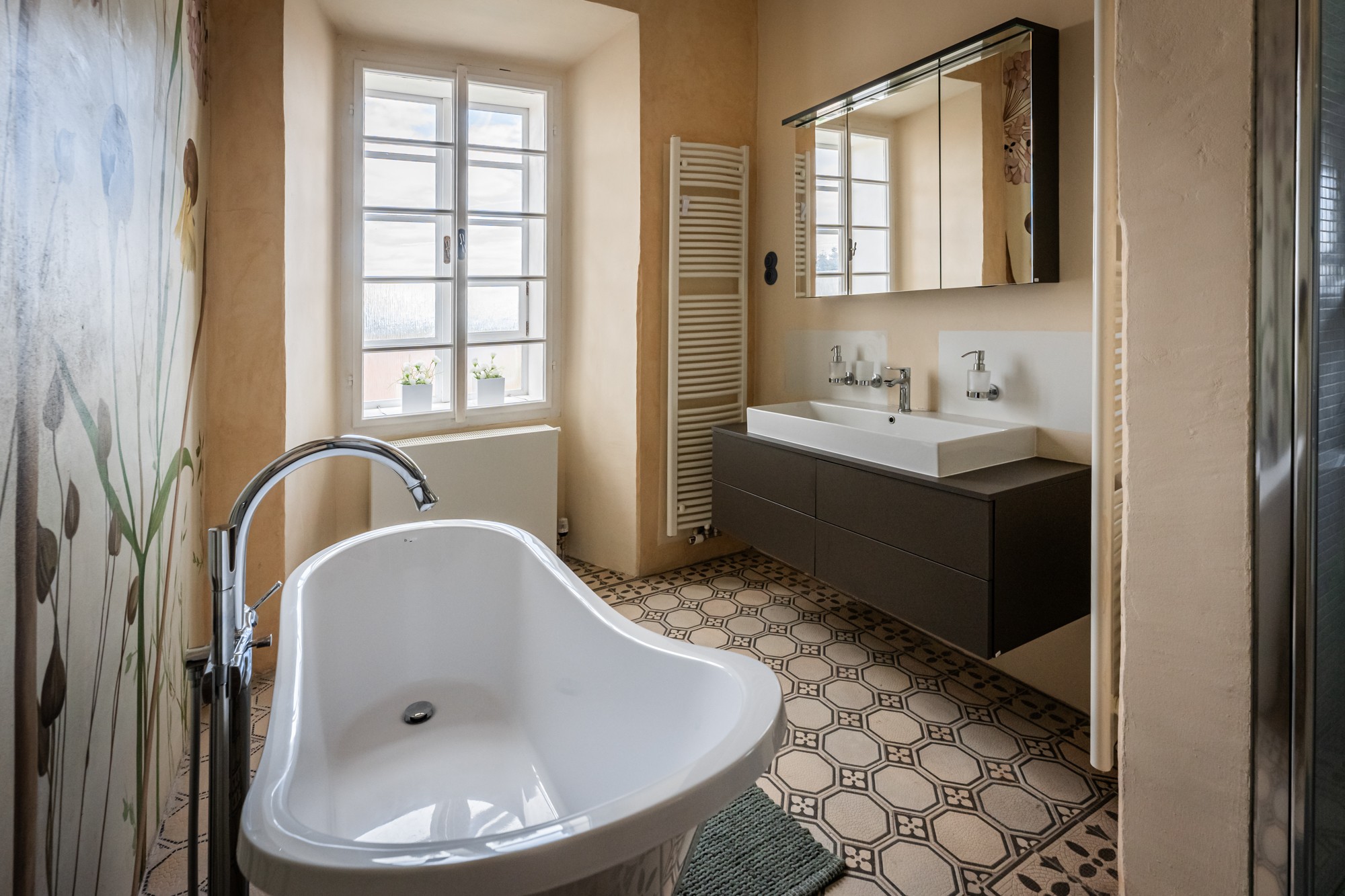 Malgré l’état préoccupant du bâtiment à l’époque, j’ai été stupéfait de constater que les planchers en bois de l’étage, vieux de plus de 400 ans, étaient encore en parfait état. Nous nous sommes contentés de les poncer légèrement et de les huiler. L’escalier date également du XVIe siècle et, sur le palier, les carreaux en terre cuite ont été laissés intacts – après quatre siècles, certaines zones sont fortement patinées. Ces traces constituent des symboles, des témoins visibles du passage du temps.