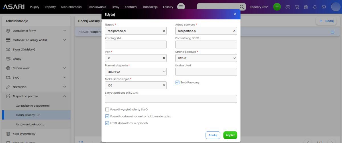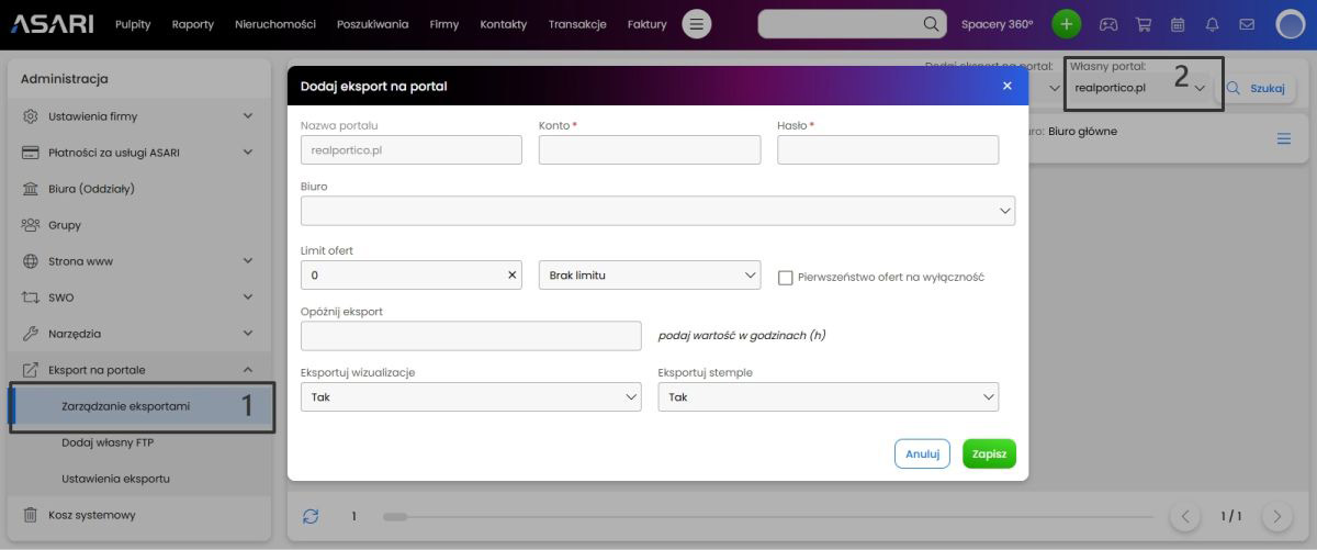 REALPORTICO to niezależny portal, który nie posiada partnerstw ani umów z innymi portalami nieruchomości, portalami ogłoszeniowymi ani systemami CMS, takimi jak ASARI CRM. Dlatego Twoje oferty nieruchomości nie pojawią się automatycznie na naszym portalu, jeśli publikujesz je za pomocą ASARI lub innego oprogramowania. Zamiast tego konieczne jest skonfigurowanie osobnego eksportu i wybranie realportico.pl w opcjach eksportu danej nieruchomości.