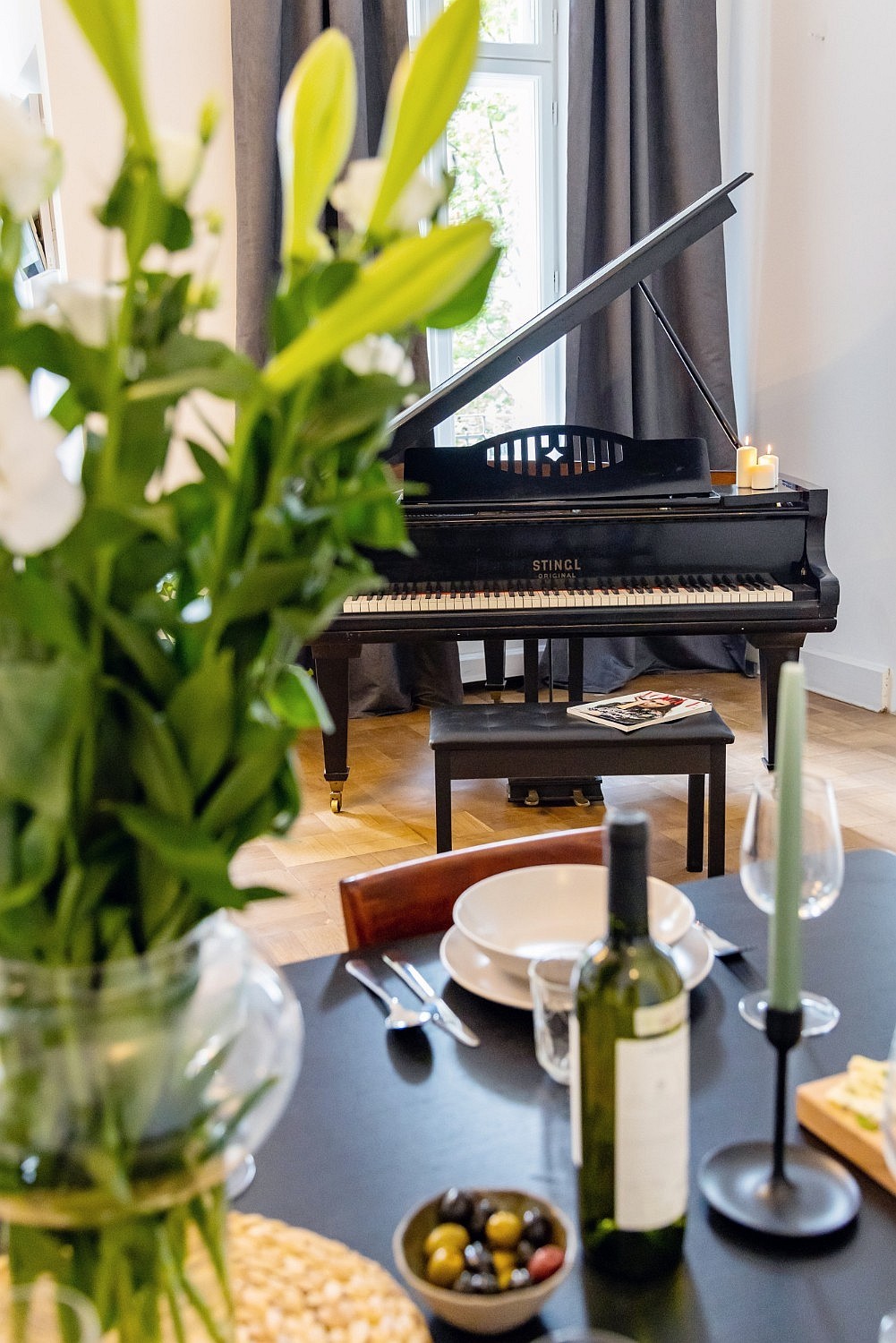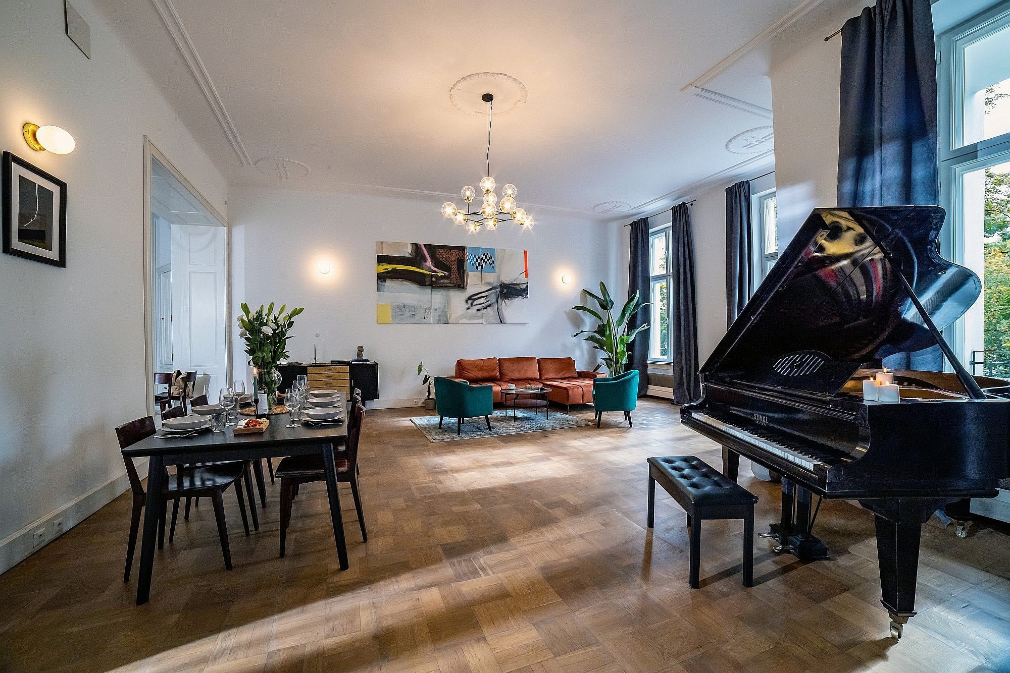 Lägenheten har generösa ytor med takhöjd på 3,50 m och högkvalitativa material. Den fullständiga renoveringen omfattade fasad, representativa trapphus och alla tekniska installationer.